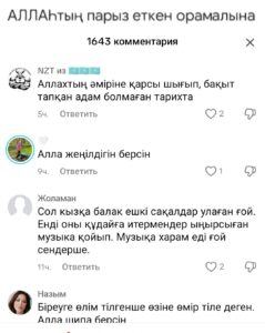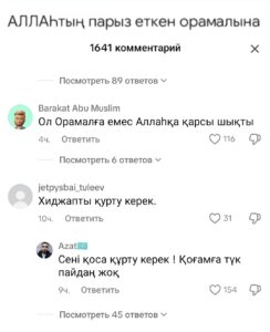 "Депутат дұрыс айтты, діни киімге тыйым салынсын" дегендерге қарсы "сол сөздерді айтқан депутат ауруға ұшырап, жазасын алуда", "Шымкент әкімінің орынбасары Сәрсен Құранбек "оқушыны намазға шақырмаңдар" деген болатын. Оның да күні санаулы", "дінге тиіскен кісінің жазасы ауыр болады" деген пікірлер жазылуда.