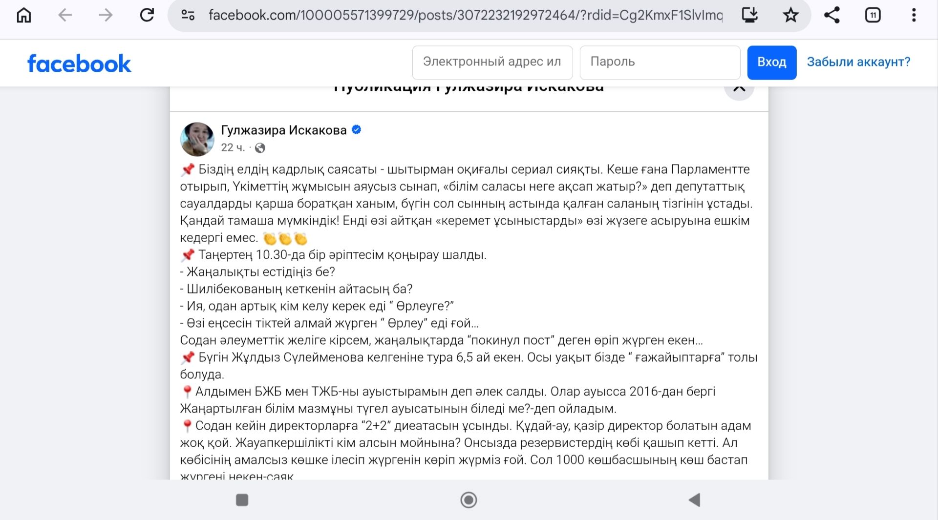 "Біздің елдің кадрлық саясаты - шытырман оқиғалы сериал сияқты. Кеше ғана Парламентте отырып, Үкіметтің жұмысын аяусыз сынап, «білім саласы неге ақсап жатыр?» деп депутаттық сауалдарды қарша боратқан ханым, бүгін сол сынның астында қалған саланың тізгінін ұстады.