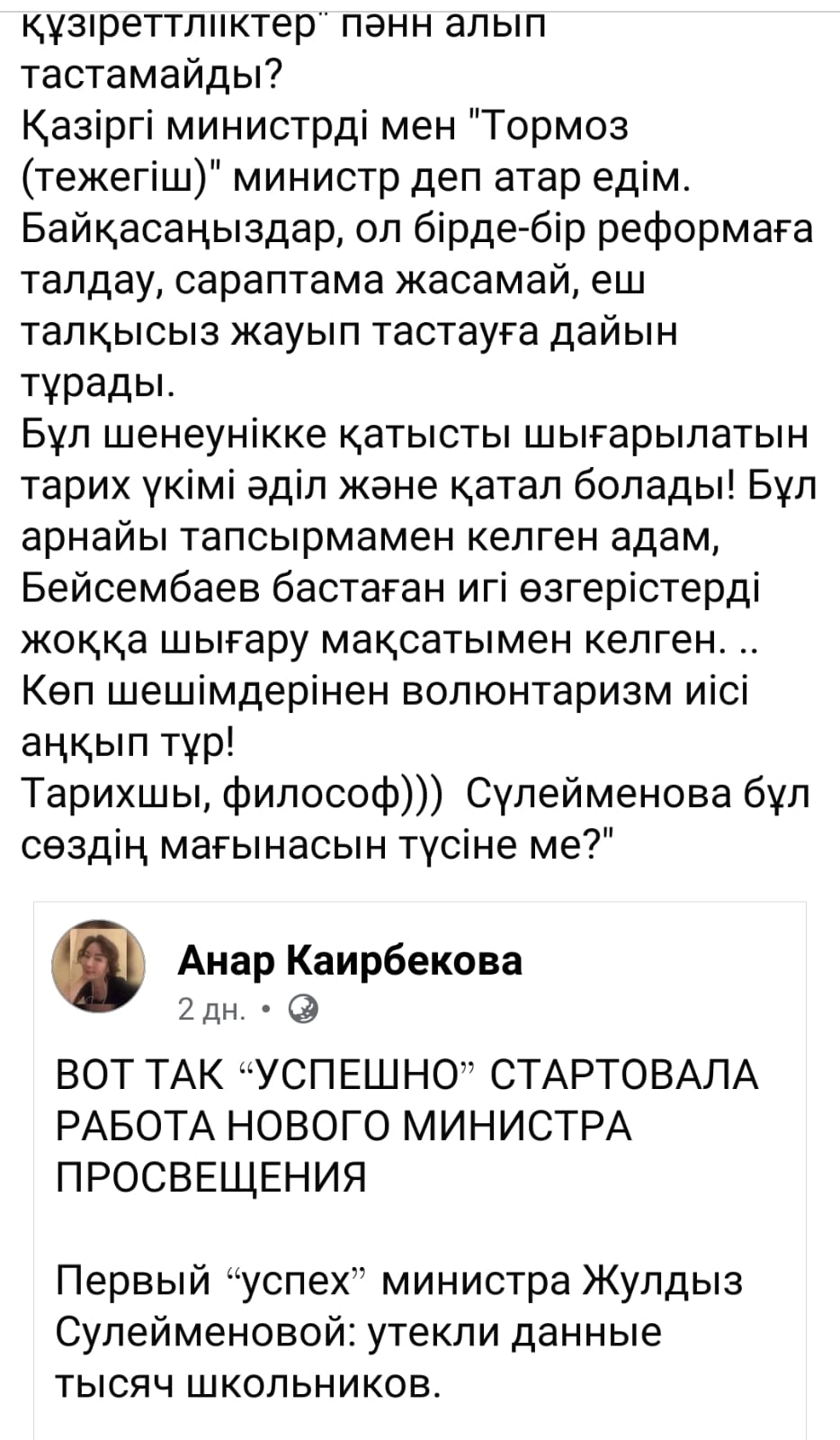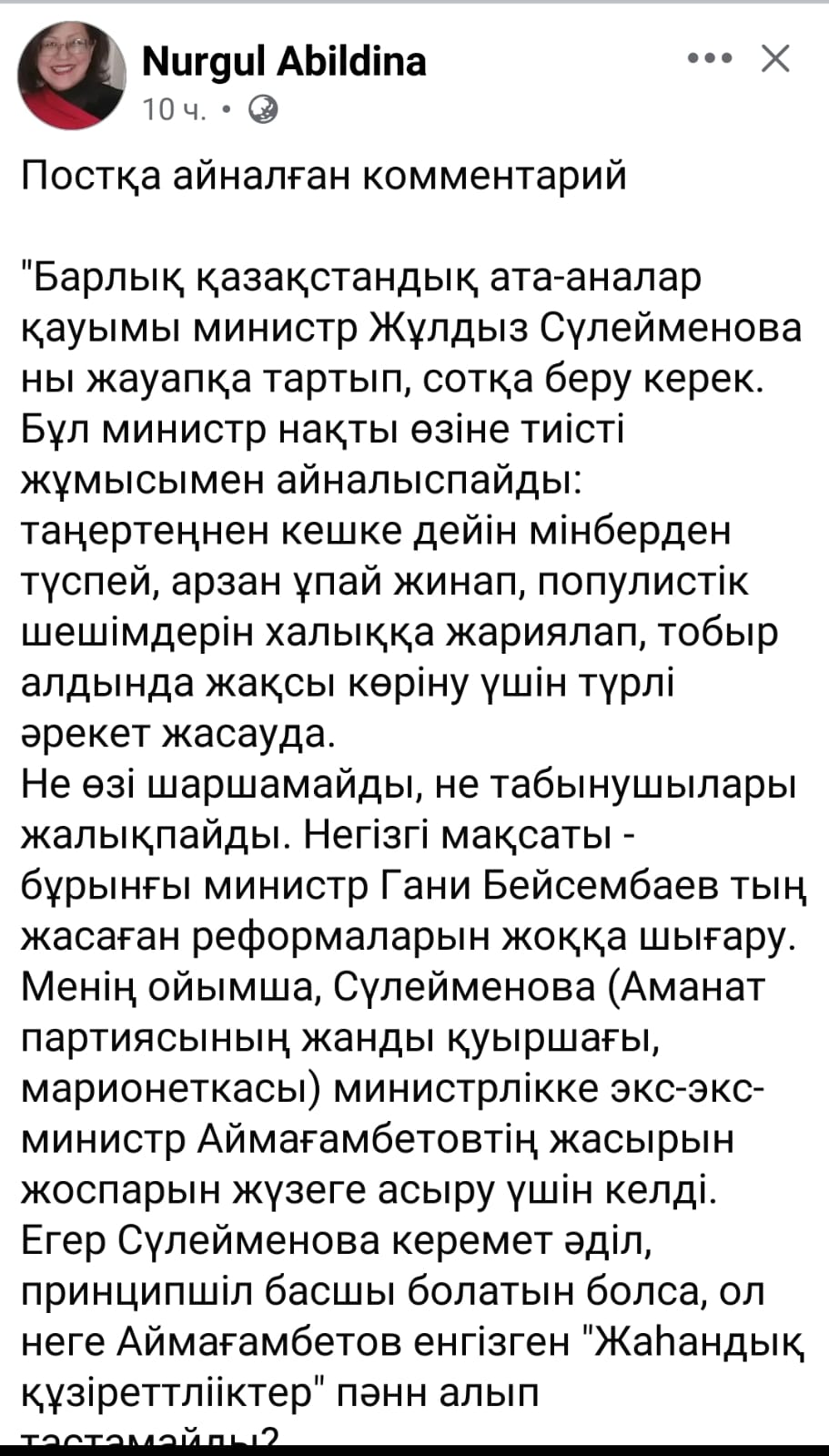 Менің ойымша, Сүлейменова (Аманат партиясының жанды қуыршағы, марионеткасы) министрлікке экс-экс-министр Аймағамбетовтің жасырын жоспарын жүзеге асыру үшін келді.