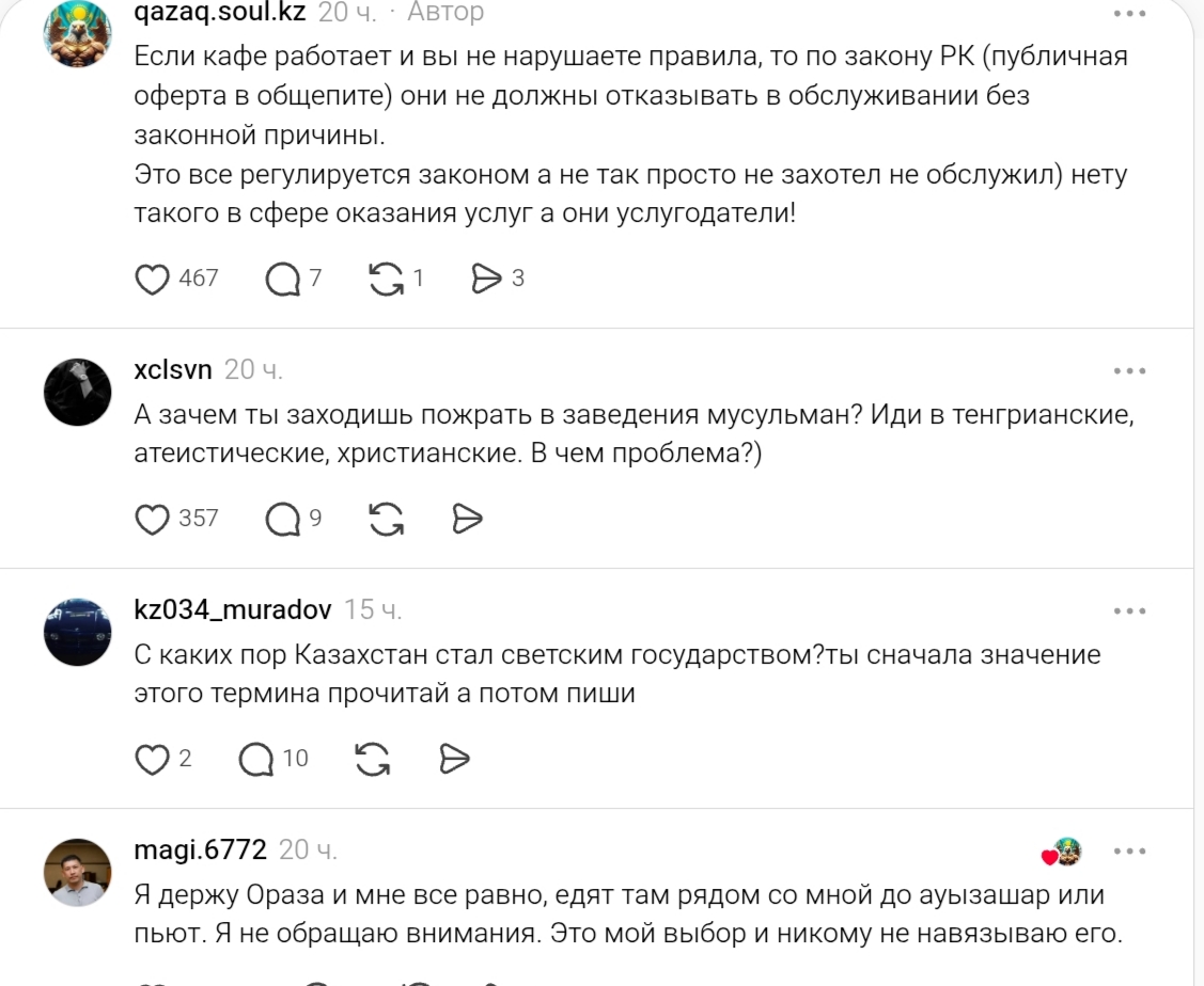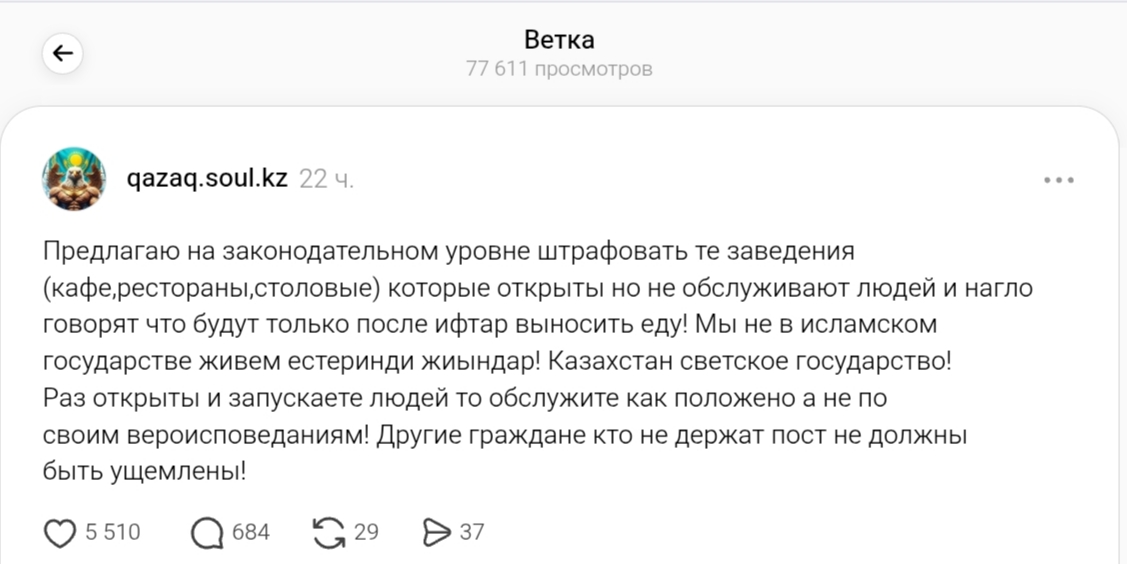 Threads әлеуметтік желісінде qazaq.soul.kz атымен тіркелген азамат ораза кезінде тамақ бермейтін дәмханаларға заңды түрде жаза кесуді сұрап, жазба жариялады.
