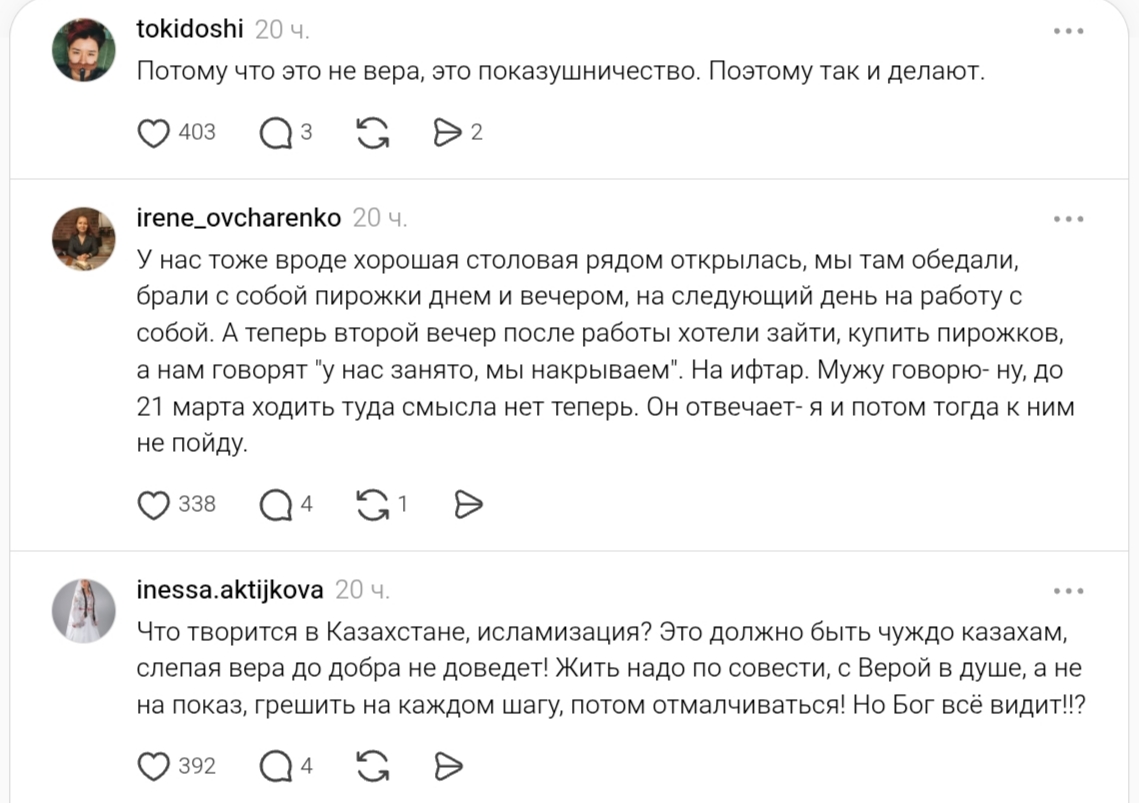Бұл жазбаны қолдаушылардан гөрі, керісінше "ораза ұстаған кісіні құрметте!"дегенді білдіретін өктем пікірлер көптеп жазылуда.