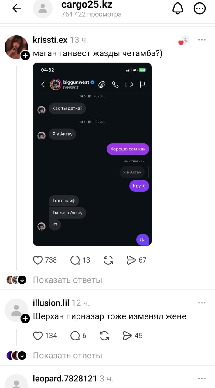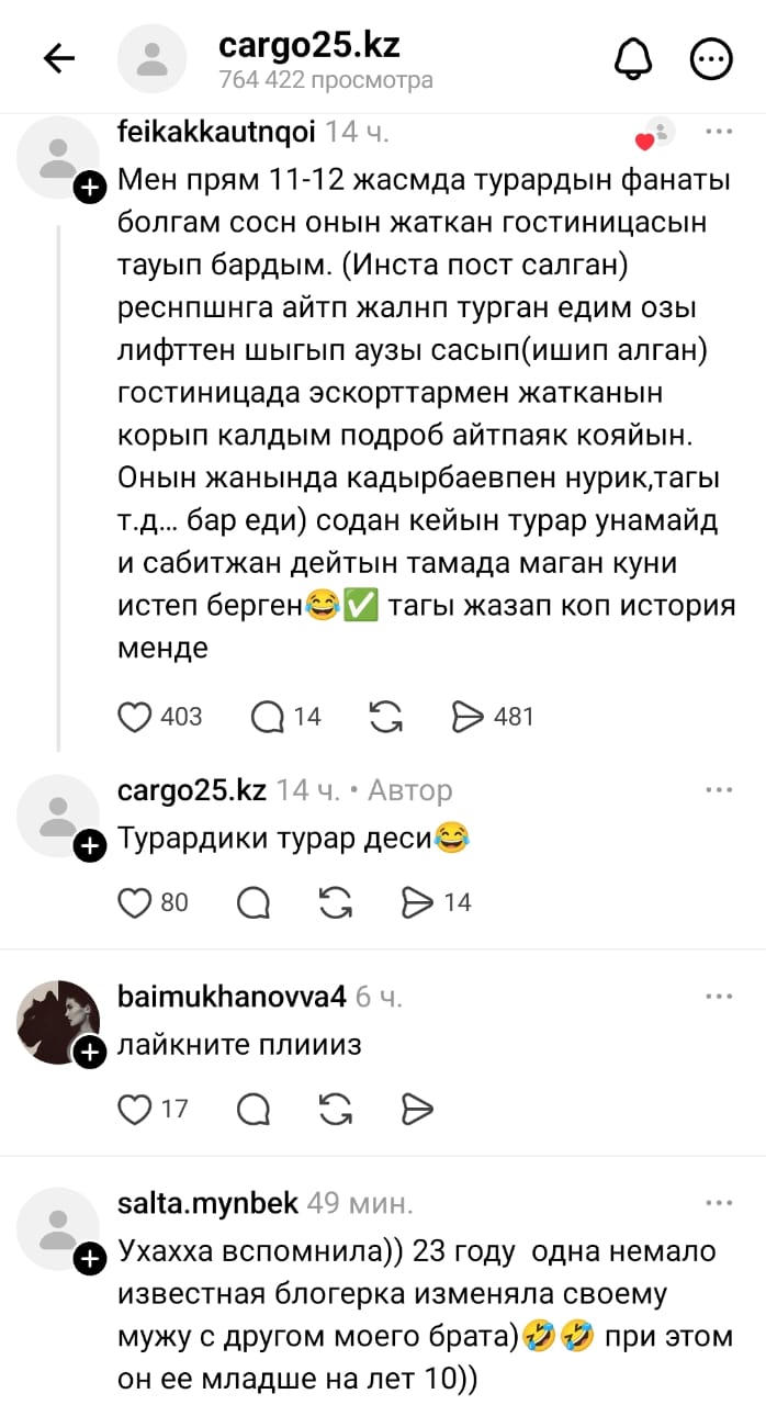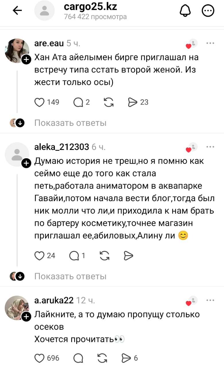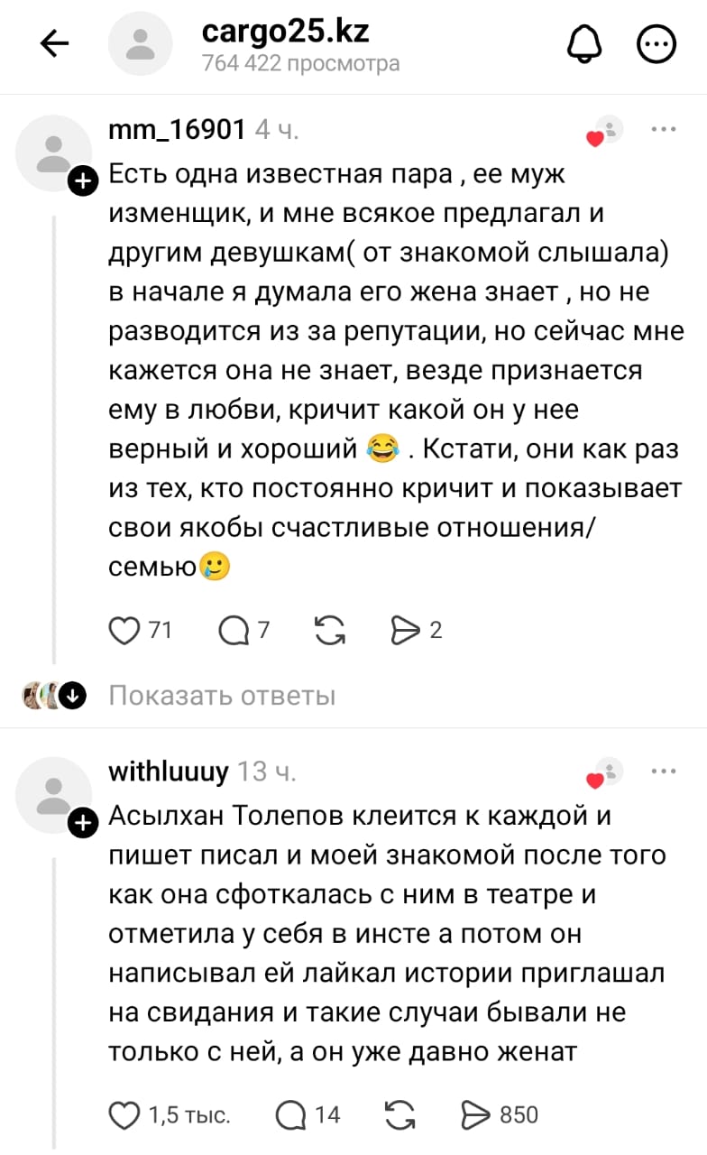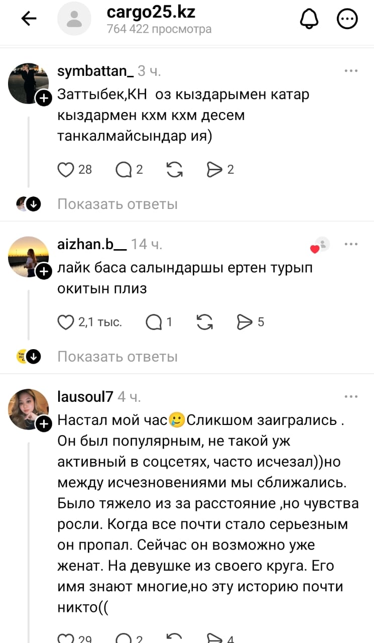 "...ашар жасайықшы. Блогер/танымал адамдардың сендерге жазғанын жіберіңдерші қыздар. Арасында "женатиктер" көп екенін білемін, бірақ дәлелдей алмаймын"деген оның жазбасына он мыңдаған адам лайк қойып, мыңдаған кісі пікірді қарша боратып жатыр.