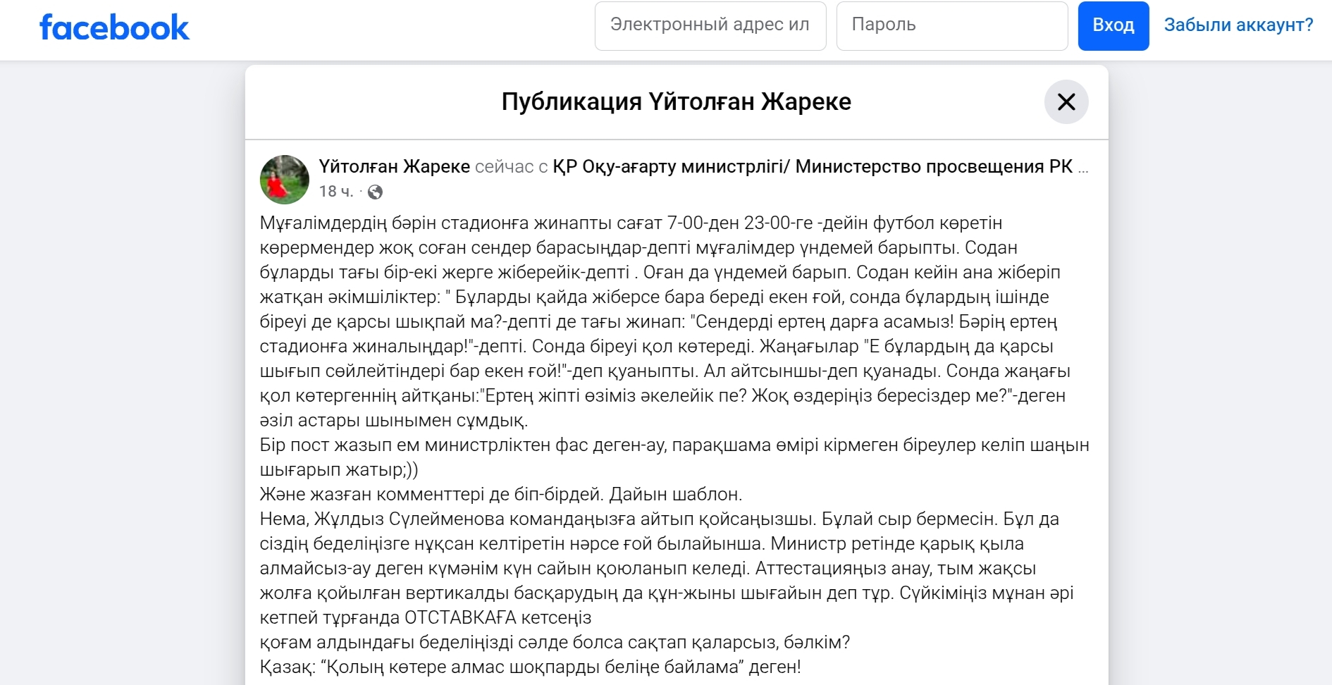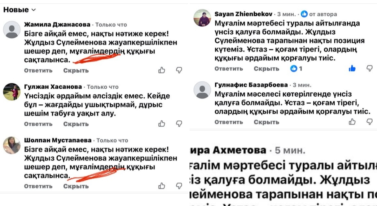 Қоғам белсендісі Үйтолған Жареке де әлеуметтік желіде мұғалімге, білімге қатысты сыни жазба жарияласа, бірден "көшірме пікірлер" жазылатынын айтады.