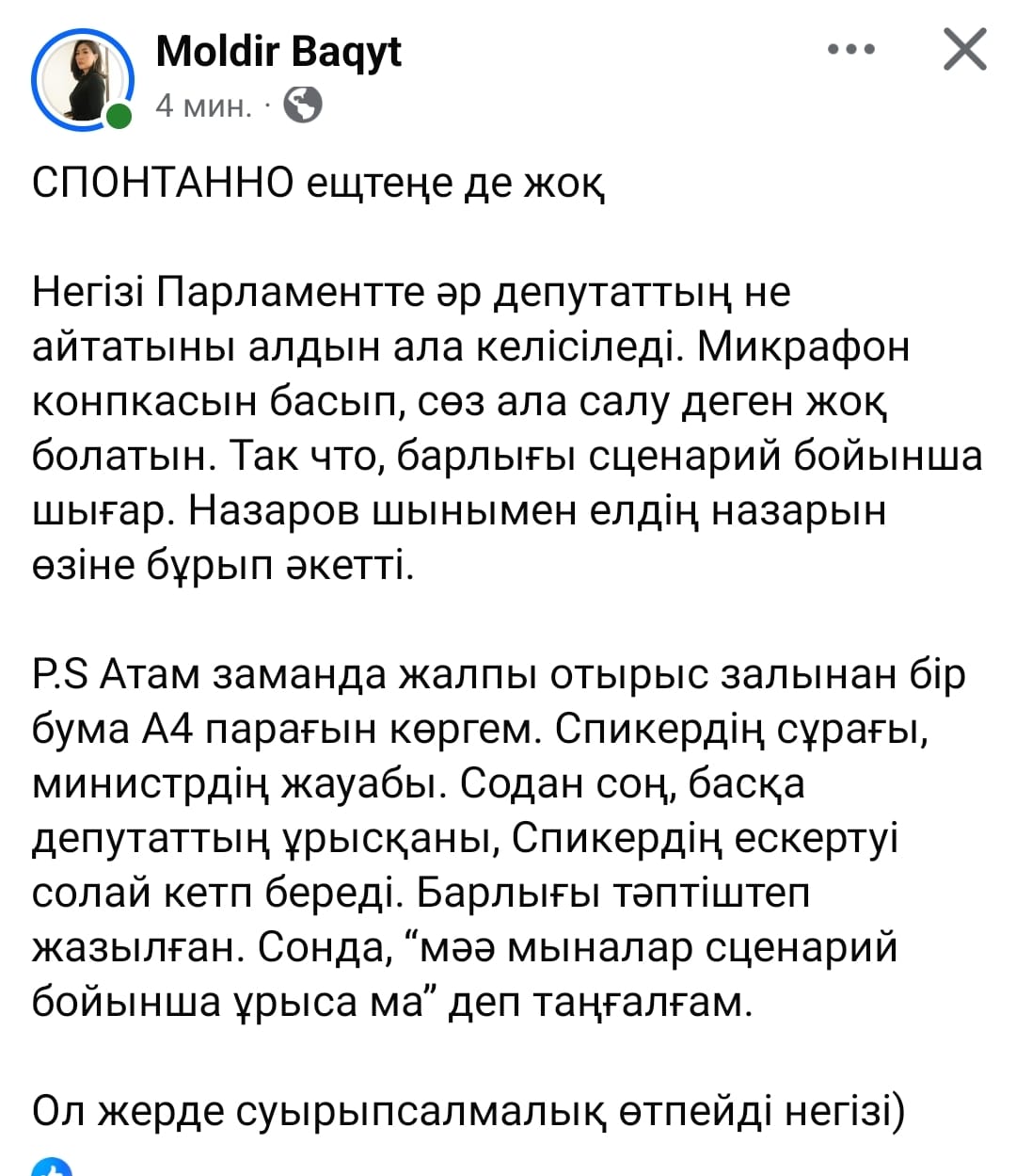Facebook әлеуметтік желісінде Ардақ Назаровтың бұл әрекетіне қатысты қоғам белсенділері мен танымал журналистер төмендегідей пікір жазуда.