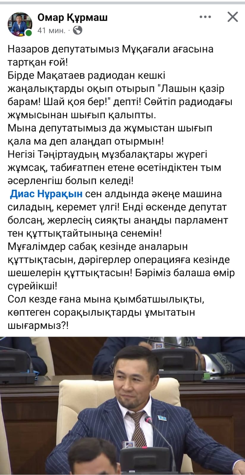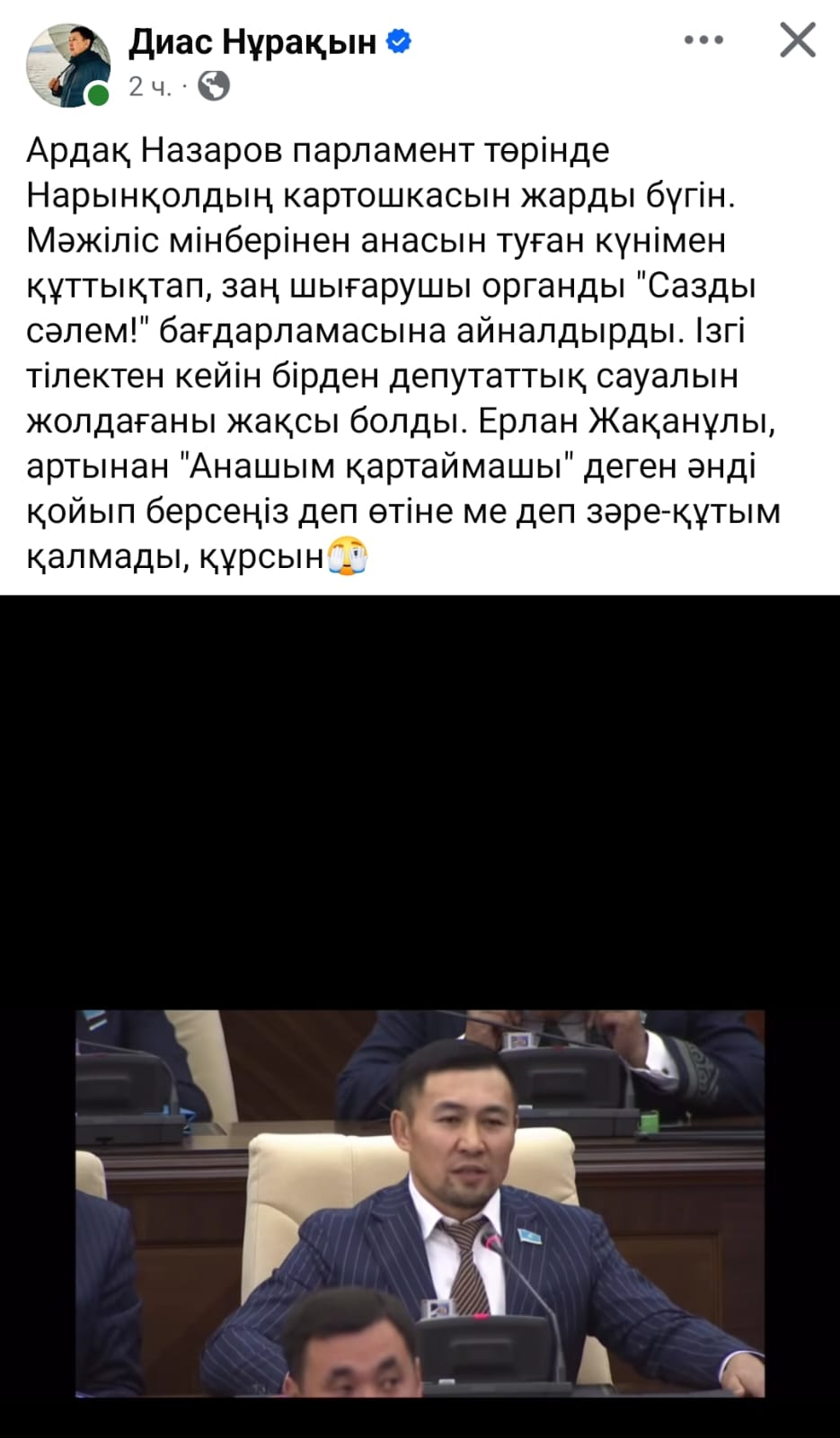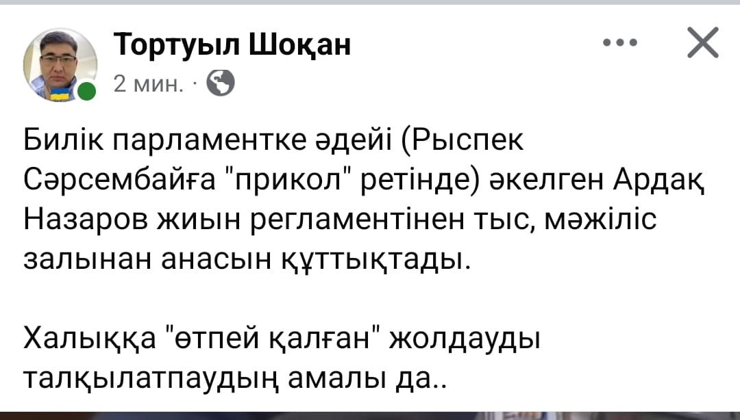 Кеше Парламент төрінен анасын құттықтаған депутат Ардақ Назаров қоғам тарапынан үлкен сынға ұшырады деп жазады Democrat.kz.