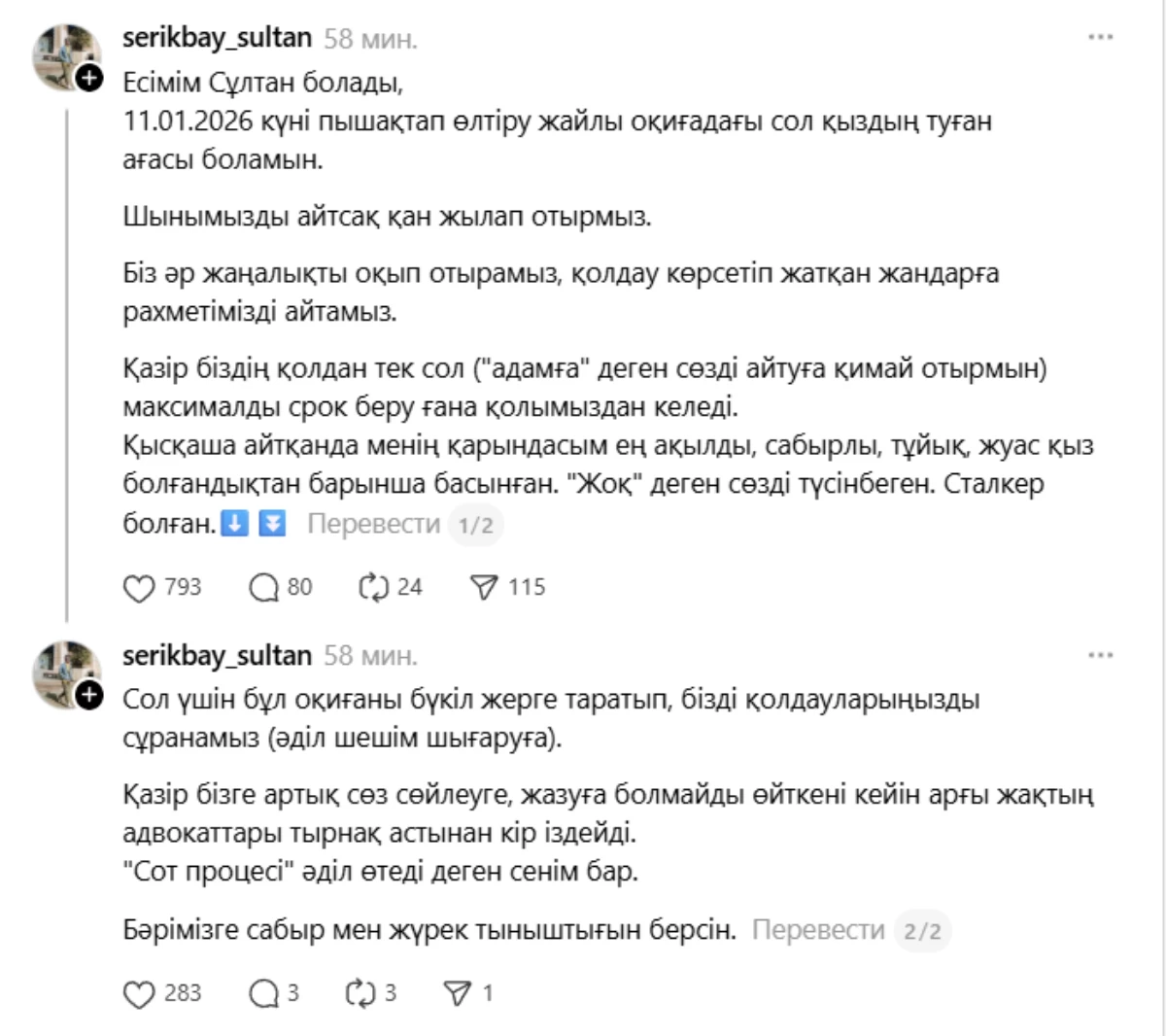 “Шынымызды айтсақ қан жылап отырмыз. Әр жаңалықты оқып отырамыз. Қолдау көрсетіп отырған жандарға рақмет айтамыз. Қазір қолымыздан сол (“адамға” деген сөзді айтуға қимай отырмын) ең жоғары жазаны беру ғана келеді. Қысқаша айтқанда қарындасым ең ақылды, сабырлы, тұйық, жуас қыз болғандықтан барынша басынған. “Жоқ” деген сөзді түсінбеген. Сталкер болған”, – деп жазды ол.