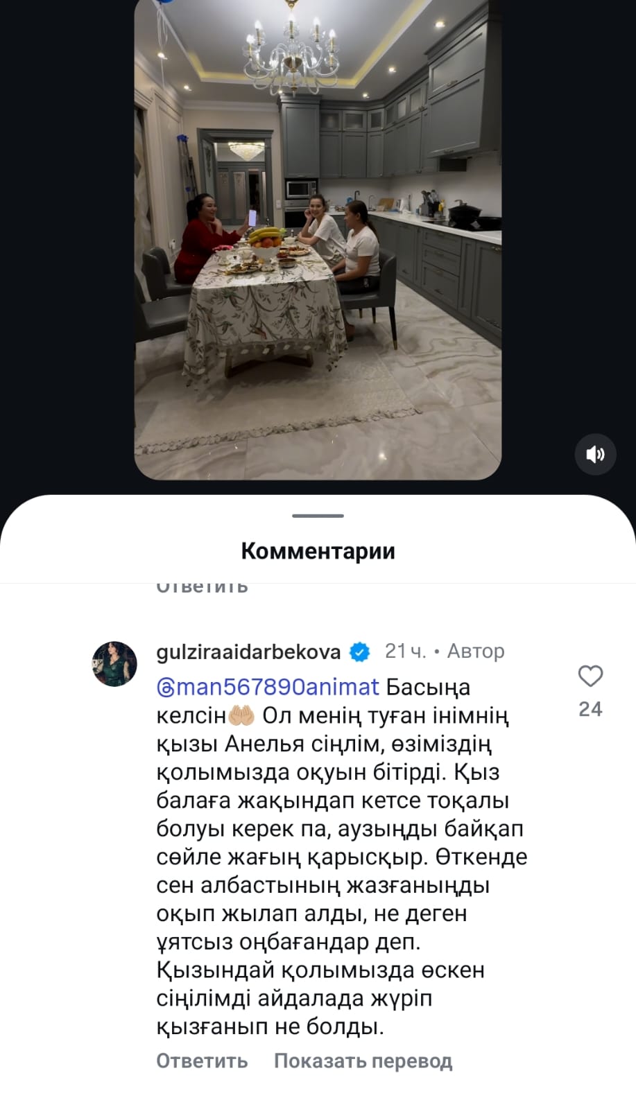 "Басыңа келсін🤲🏼 Ол менің туған інімнің қызы Анелья сіңлім, өзіміздің қолымызда оқуын бітірді. Қыз балаға жақындап кетсе тоқалы болуы керек па, аузыңды байқап сөйле жағың қарысқыр. Өткенде сен албастының жазғаныңды оқып жылап алды, не деген ұятсыз оңбағандар деп. Қызындай қолымызда өскен сіңілімді айдалада жүріп қызғанып не болды"деп жауап пікір жазған Гүлзира Айдарбековаға бір оқырманы үйде жүрген қызды "тоқал" деп ауыр дүние жазған сыңайлы.
