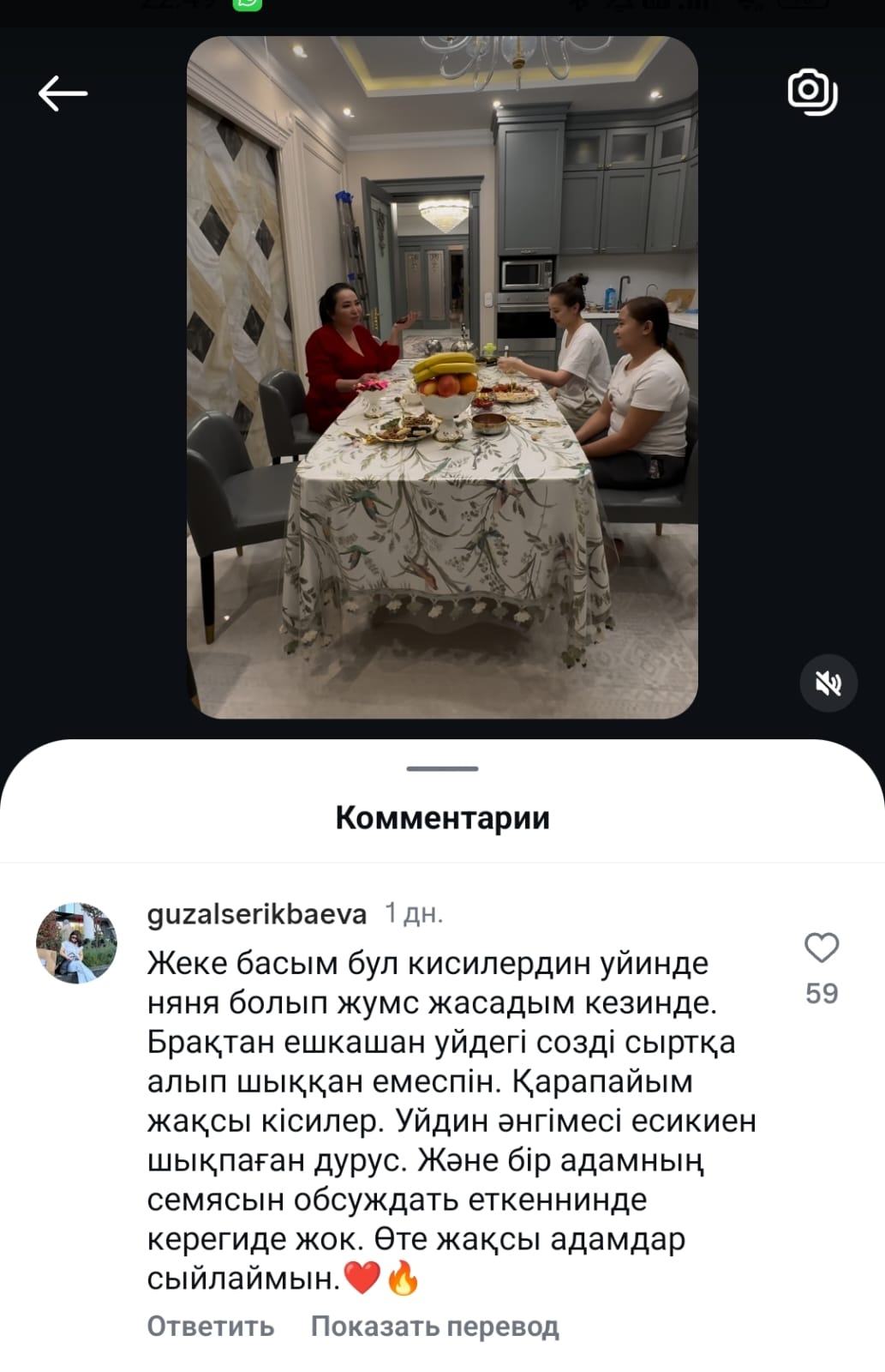 Келініне филиппиндік күтуші жалдап бергенін айтып, видео жариялаған Гүлзира Айдарбекованың жазбасының астына бір қыз бұл отбасы туралы жақсы білетінін жазды деп жазады Democrat.kz.