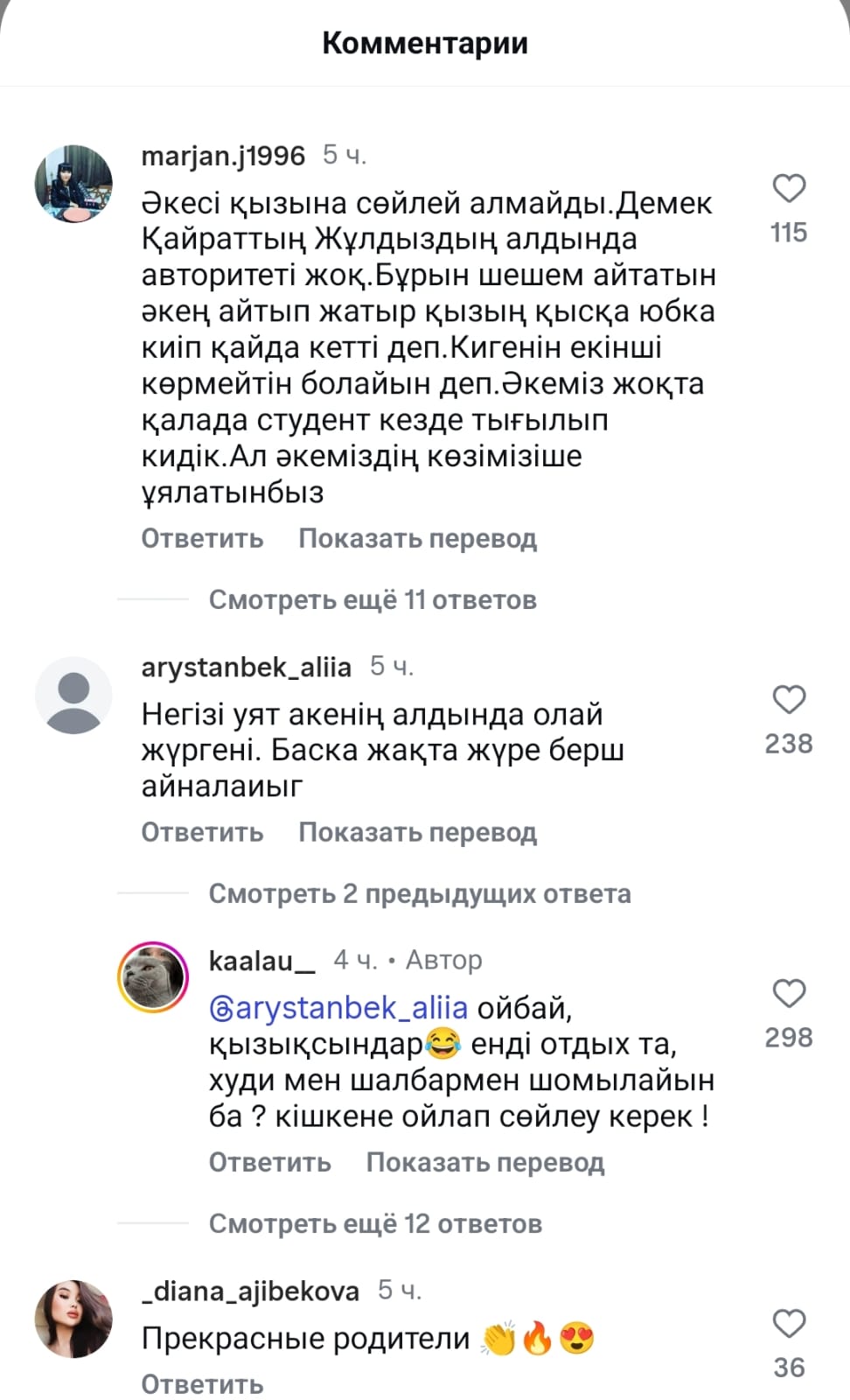 "Әкем мен шешем де қасымда"дегенді көрсетіп, видео жариялаған Алау Қайратқызы "суға шомылғанда, киіммен түспеймін ғой, сынай бермей, ойлансаңдаршы" деген Қайраттың қызы өзгелерге "өзім білем" дегенді жұқалап жеткізді.