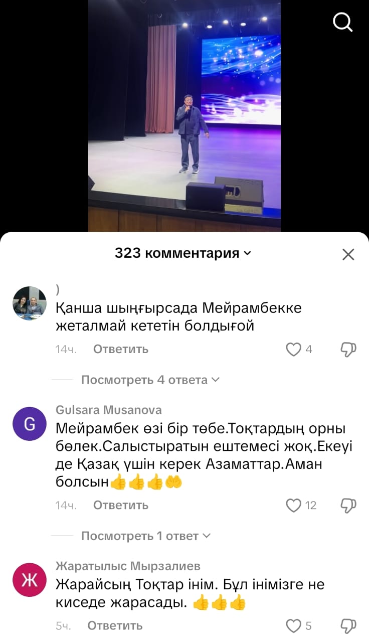 "Аяқта кроссовка, шалбары үтік көрмеген" деп әншінің сырт кейпін сөз еткендер "қанша шыңғырса да, Мейрамбектей бола алмайды" деген пікір жазуда.