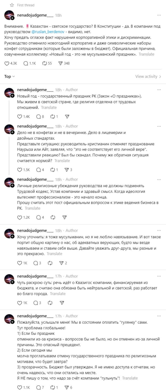 Threads әлеуметтік желісінде «nenadojudgeme____» есімді қолданушы шенеунікті діни көзқарасы үшін ұжымдық мерекені шектеді деп айыптады.