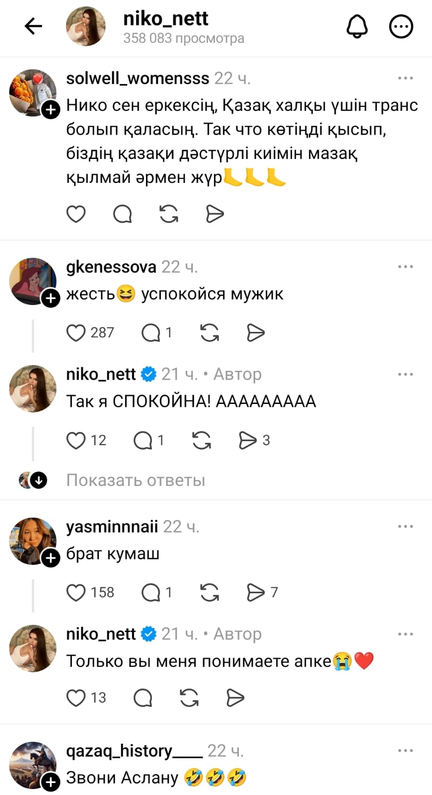 "Еркекте овуляция болмайды, қумашы", "бос сандырақтың керегі не?", "мамаңа хабарлас, екеуің бірге едіңдер ғой", "қадіріңді қашырмашы", "қоя салшы" деп жатқандар трансгендердің сөздерін бос сөзге балауда.