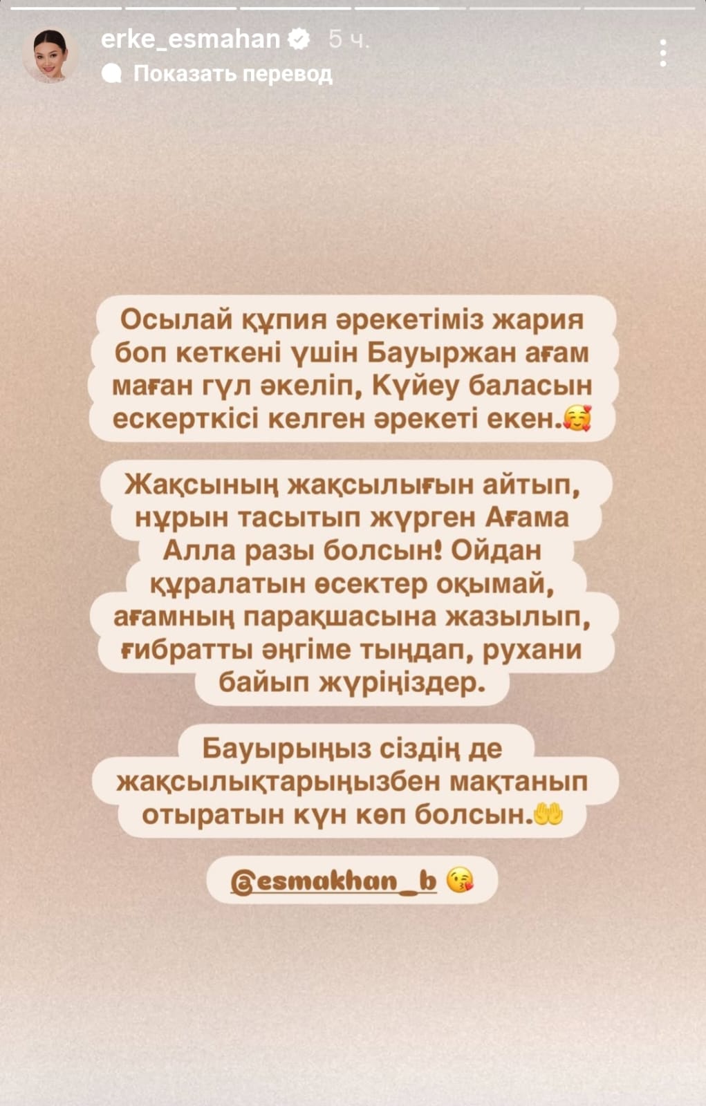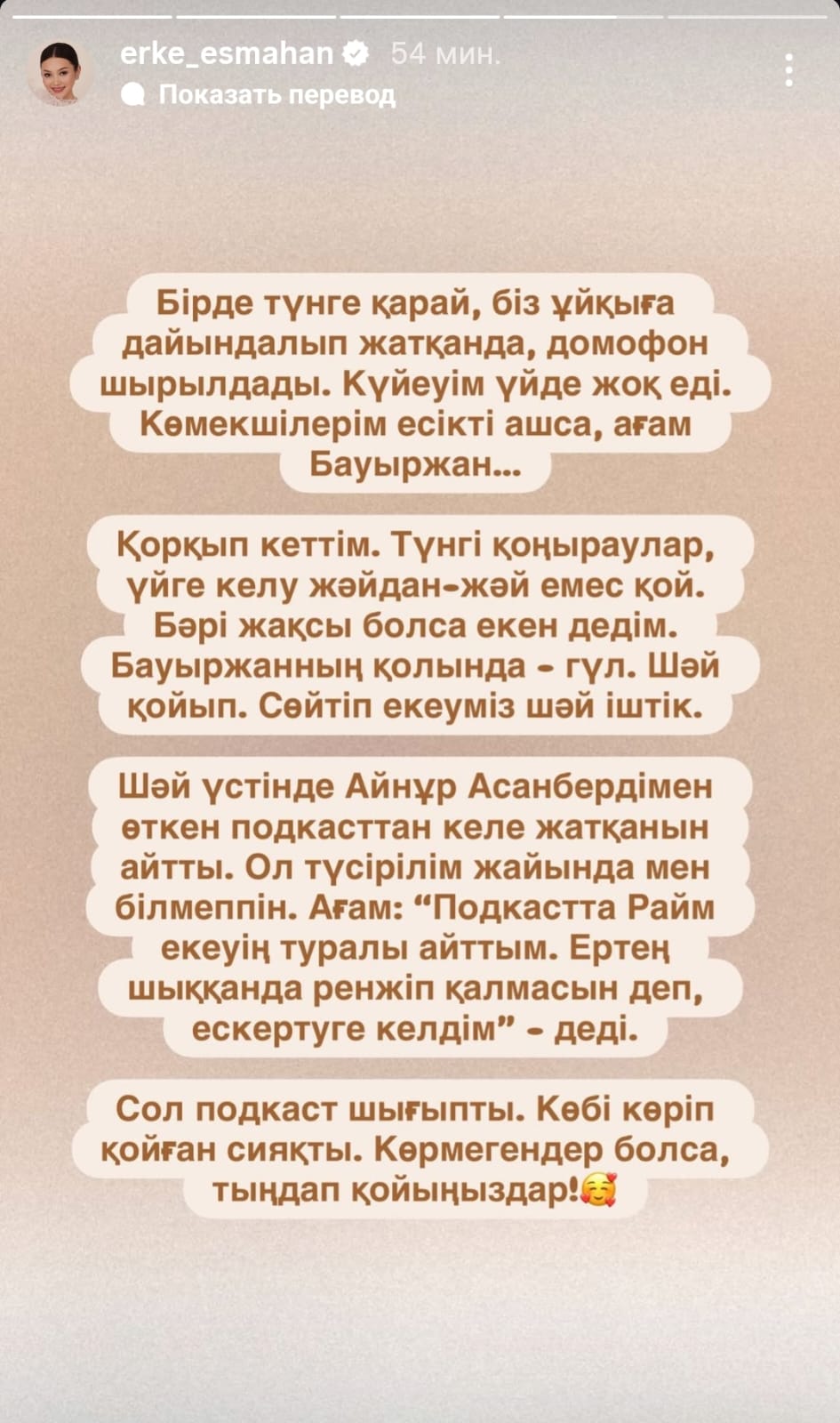 Сол подкаст шығыпты. Көрмегендер болса, көріңіздер. Осылай құпия әрекетіміз жария болып кеткен соң, ағам Бауыржан маған гүл әкеліп, күйеубаласын ескерткісі келген екен" деп жазды Ерке Есмахан. (Мақаланың өңін өзгертіп, ұрлап, сілтемесіз көшіріп басқан сайтты сотқа беретінімізді ескертеміз!)