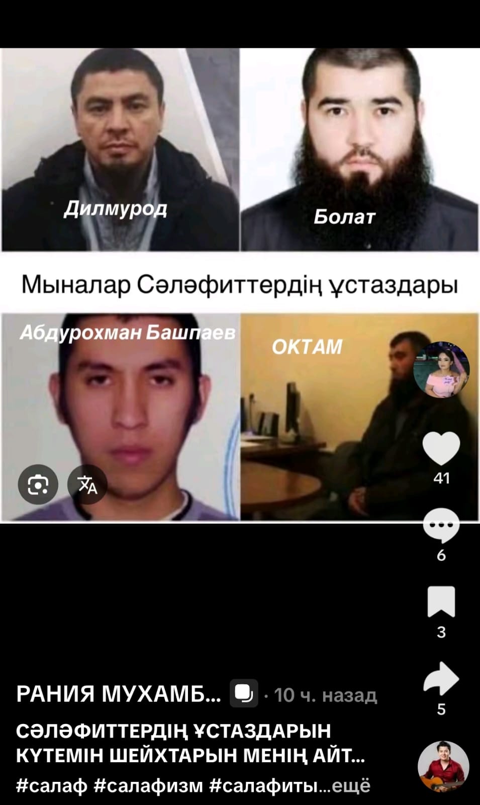 "Абзалдың әрекетіне қатысты ҰҚКге, полицияға шағымдандым. Түк шықпады. Құқық қорғау органдарын салафиттер сырт еткізіп өз жағына шығарып ала алады. Полицияға арыздансам, салафиттер ақша беріп, арызды жаптырып тастайды. Абзалмен үш жыл тұрдым. Сол үш жылда ол жүргізуші куәлігінсіз, алаңсыз көлік айдап жүрді. Салафиттер бәрін парамен шешеді. Параны харам деп қойып, өздері қолданады"деген Рания біздің елдегі ықпалды салафиттердің суреттерін жариялады.
