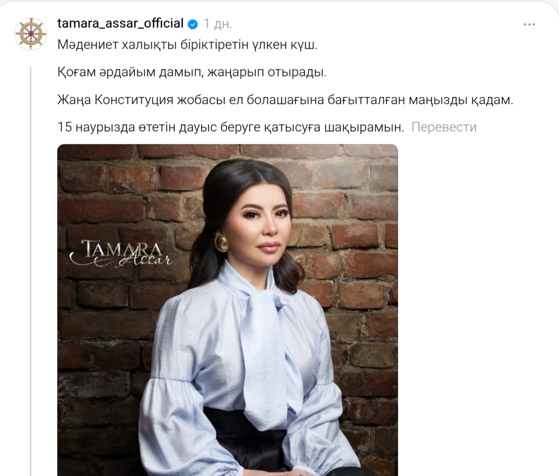 Әлеуметтік желіде әнші Тамара Асардың жаңа Конституцияны қолдап жазған жазбасына жұрт жағымсыз пікір жазып, сынап жатыр деп жазады Democrat.kz.