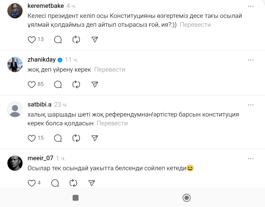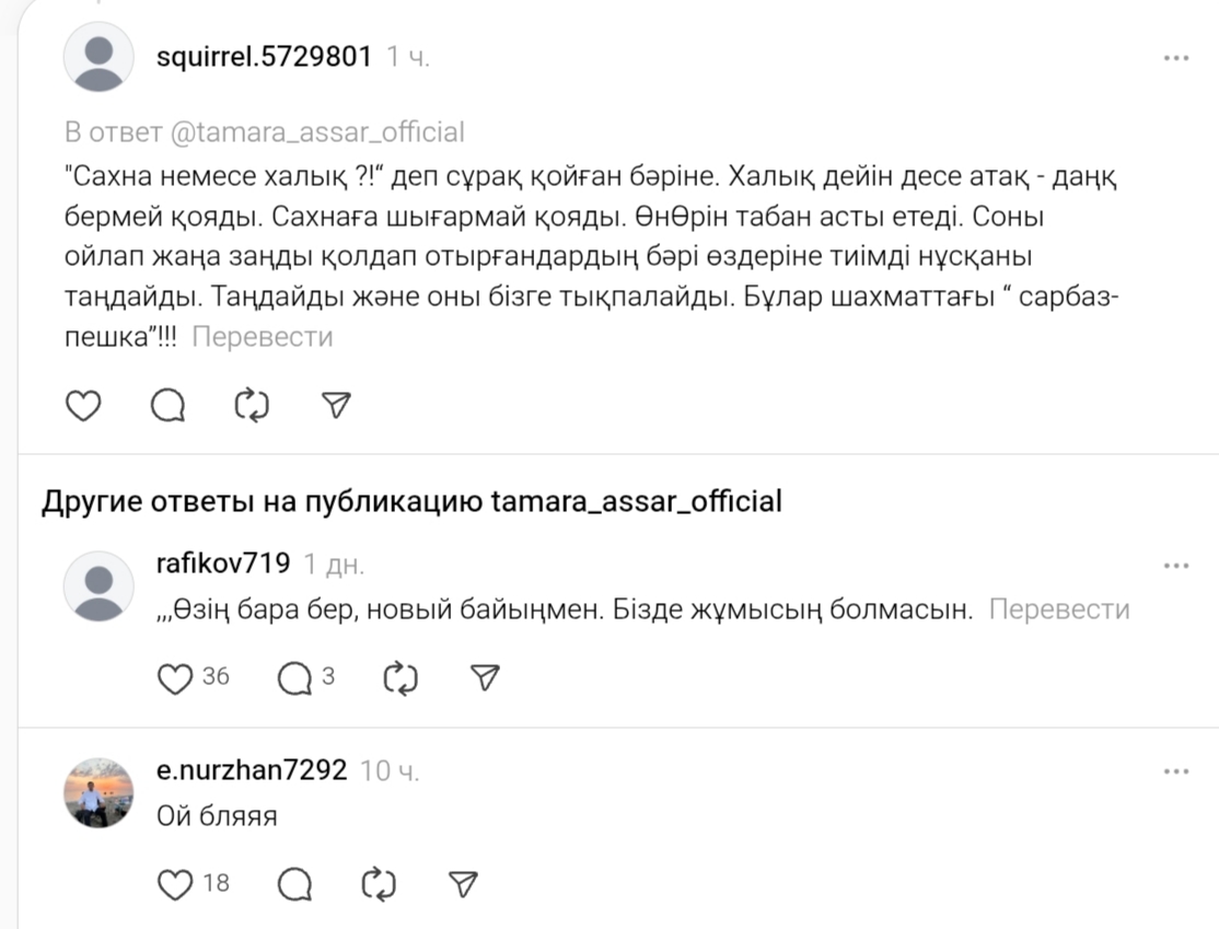 Алайда әншінің бұл жазбасына Threads желісіндегі оның оқырмандары "өзің бара бер новый байыңмен, бізге керегі жоқ", "жоқ деп үйрену керек", "келесі президент келіп, өзгертеміз десе, ол кезде де осылай қолдаймын деп отырасыз ғой иә?", ""Сахна немесе халық ?!“ деп сұрақ қойған бәріне. Халық дейін десе атақ - даңқ бермей қояды. Сахнаға шығармай қояды. ӨнӨрін табан асты етеді. Соны ойлап жаңа заңды қолдап отырғандардың бәрі өздеріне тиімді нұсқаны таңдайды. Таңдайды және оны бізге тықпалайды. Бұлар шахматтағы “ сарбаз- пешка”!!! Дегенге саятын пікірлер жазып жатыр.