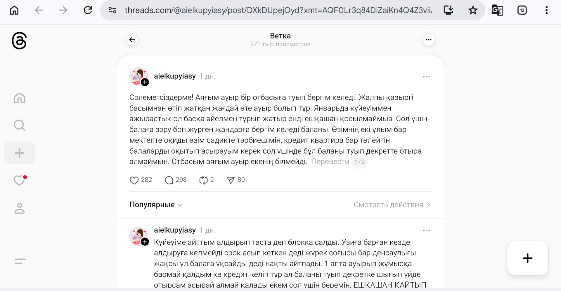Threads желісін қолданушы келіншектің: "Сәлеметсіздерме! Аяғым ауыр бір отбасыға туып бергім келеді. Жалпы қазыргі басымнан өтіп жатқан жағдай өте ауыр болып тұр. Январьда күйеуіммен ажырастық ол басқа әйелмен тұрып жатыр енді ешқашан қосылмаймыз.