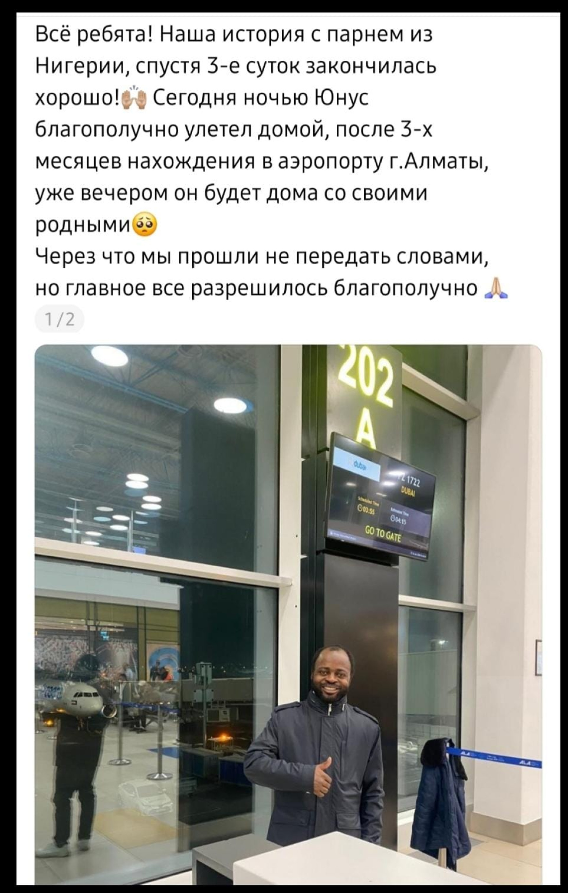 «Нигериядан келген жігіт туралы оқиға үш тәуліктен кейін жақсы аяқталды. Бүгін түнде Юнус Алматы қаласының әуежайында үш ай болғаннан кейін аман-есен үйіне ұшып кетті, кешке қарай ол туған-туыстарының қасында болады. Біз бастан өткергенді сөзбен жеткізу қиын, ең бастысы — бәрі сәтті шешілді», — деді автор.