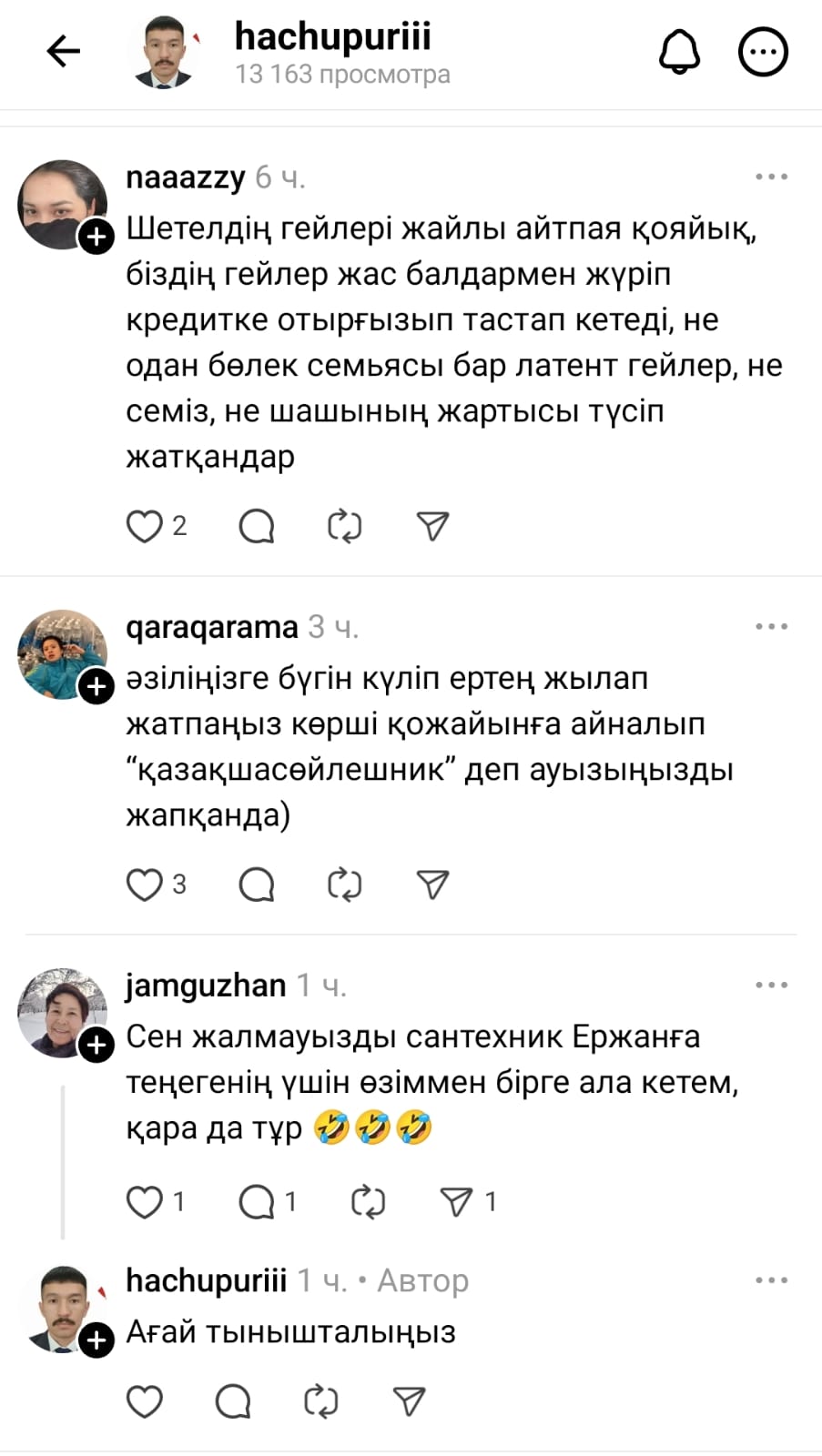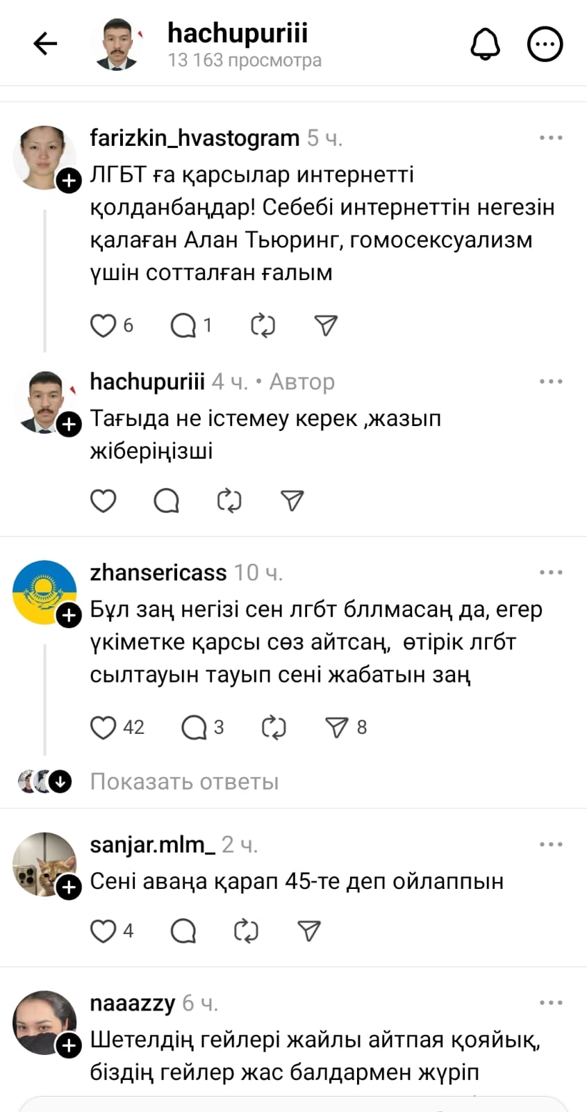 "ЛГБТ пропагандасы тұралы заңды шығарып дұрыс қылды Әйтпесе,АҚШ, Еуропа дағы лесби қыздарға қарап сүйсінесін, әдемі,секси болып келеді, Ал Қазақстан дағы лесбилердің түрі анау, 40 жасар сантехник Ержан дейтін ағаларға ұқсайды" деп жазды hachupuriii атымен тіркелген Threads қолданушы.