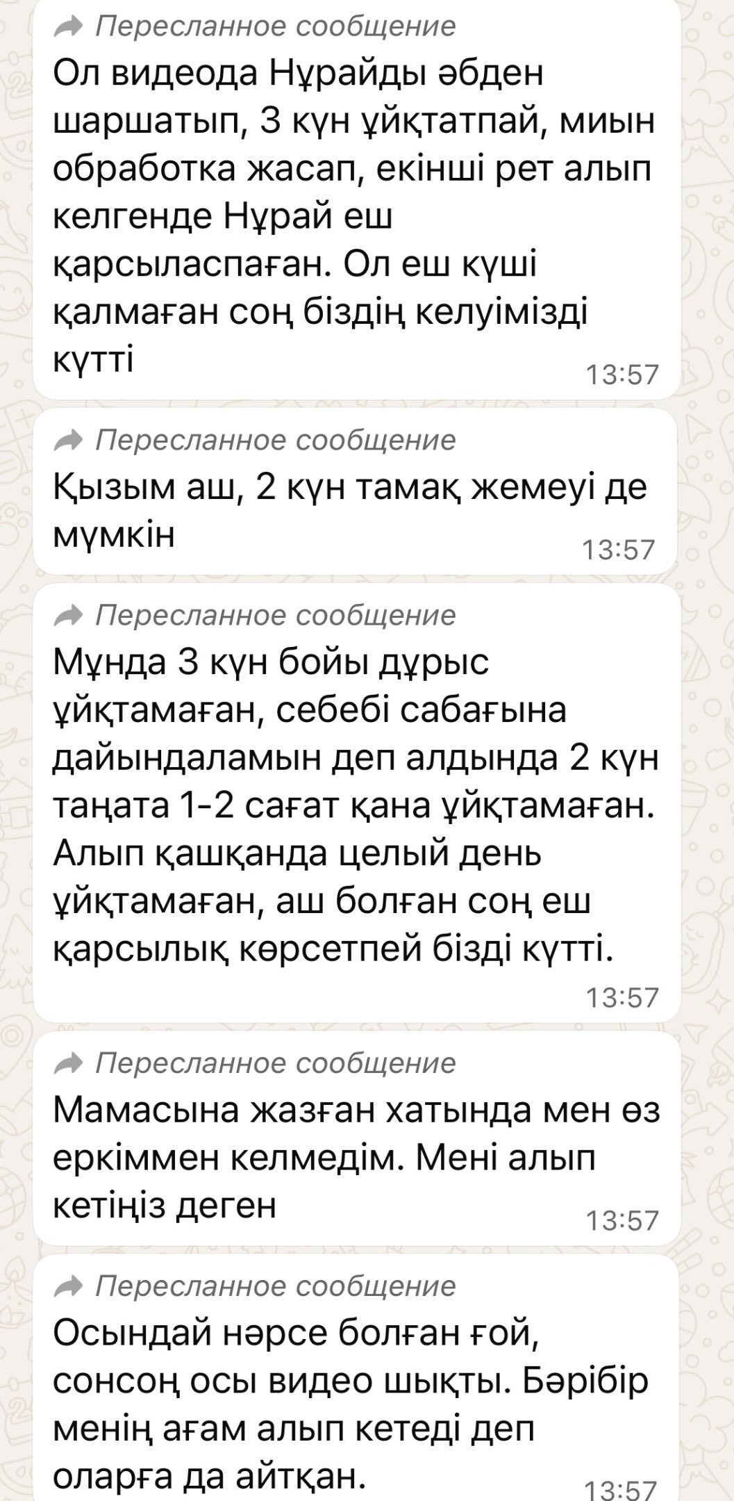 Баласынан айырылып, қабырғасы сөгіліп отырған әйел өз хабарламасында Шерхан Нұрайды алып қашқанда қандай жағдайда болғанын, көнуге мәжбүр болғанын жасырмай жазған көрінеді.