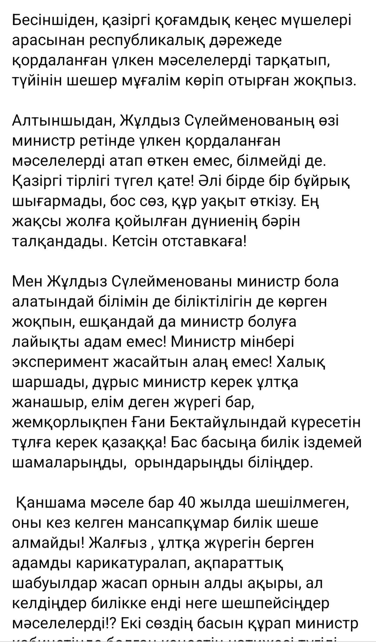Мен 2023 ж. мамыр айынан желтоқсанның соңына дейін біресе полицияға жауап беріп, біресе сотқа тартылып, әуре-сарсаңға түскен соң "ОАМ министрі Ғ. Бейсембаев орнынан кетсін" деп президентке үндеу жасадым!