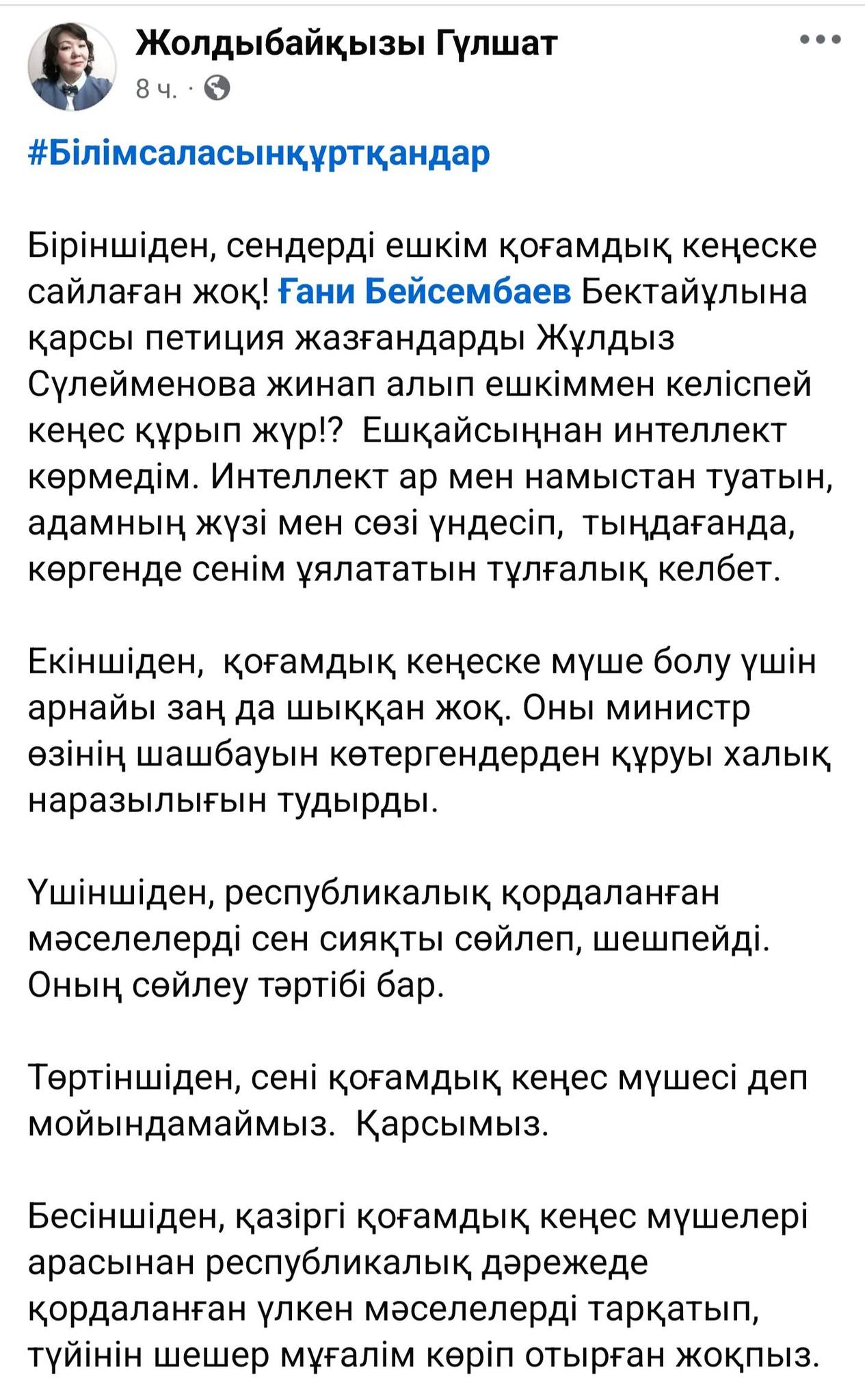 "Біріншіден, мен Ғ. Бейсембаевқа қарсы петиция жазған жоқпын!