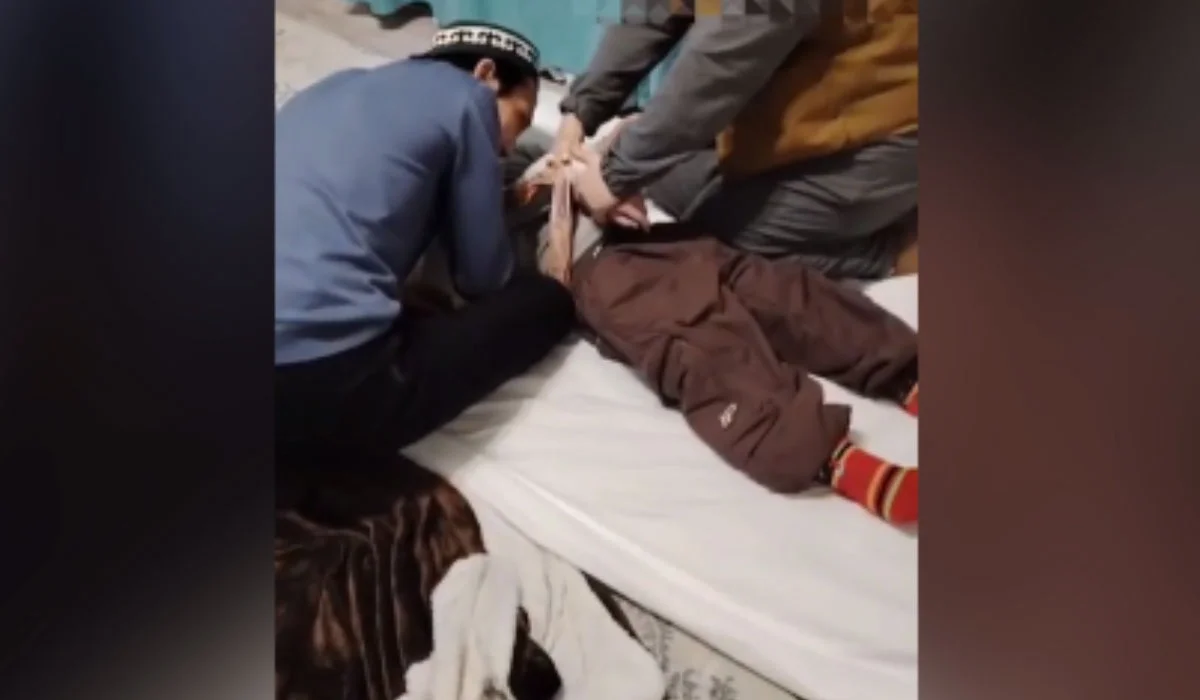 Видеода екі ер адам жерде жатқан қыз баланың қолын байлап, тамағынан қысып жатқанын көруге болады. Емші баланың ішіндегі «шайтанмен» сөйлескендей түр танытып, сұрақтар қойып отыр. Қиналған бала жылап жауап беріп жатыр.