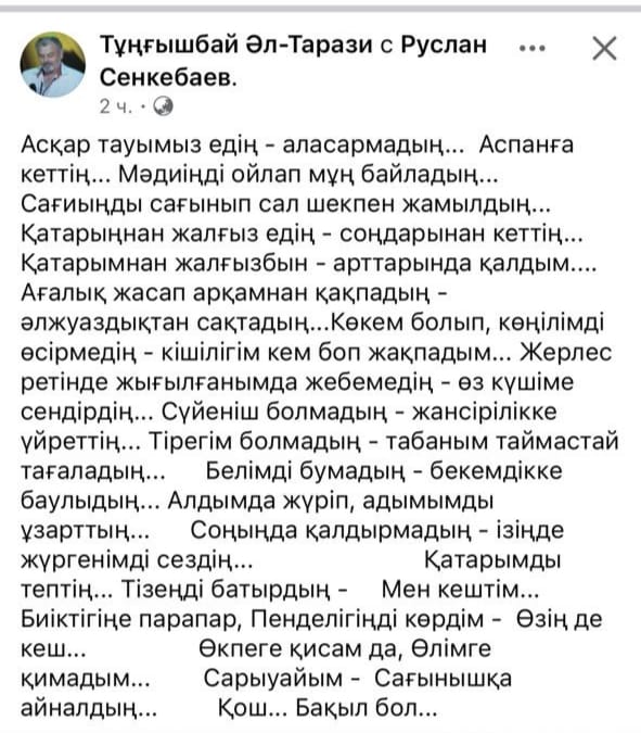 "Асқар тауымыз едің - аласармадың... Аспанға кеттің... Мәдиіңді ойлап мұң байладың... Сағиыңды сағынып сал шекпен жамылдың... Қатарыңнан жалғыз едің - соңдарынан кеттің...