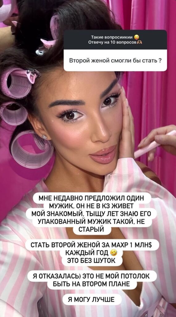 Келесі stories-те ер адамның ұсынған мәһрінің сомасын калькуляторға салып есептеп, айына 42,6 млн теңгеге жуық шығатынын айтқан. «Оған қоса, биркин, анау-мынаулары тағы бар», – деп жазды. Оқырман болса, «Қуана-қуана келісер едім. Жалынайын, сол ер адамды маған бере салыңызшы. Тілеуіңізді тілеп өтемін. Шіркеуге жиі барып тұрамын», – деп жазып жатыр.