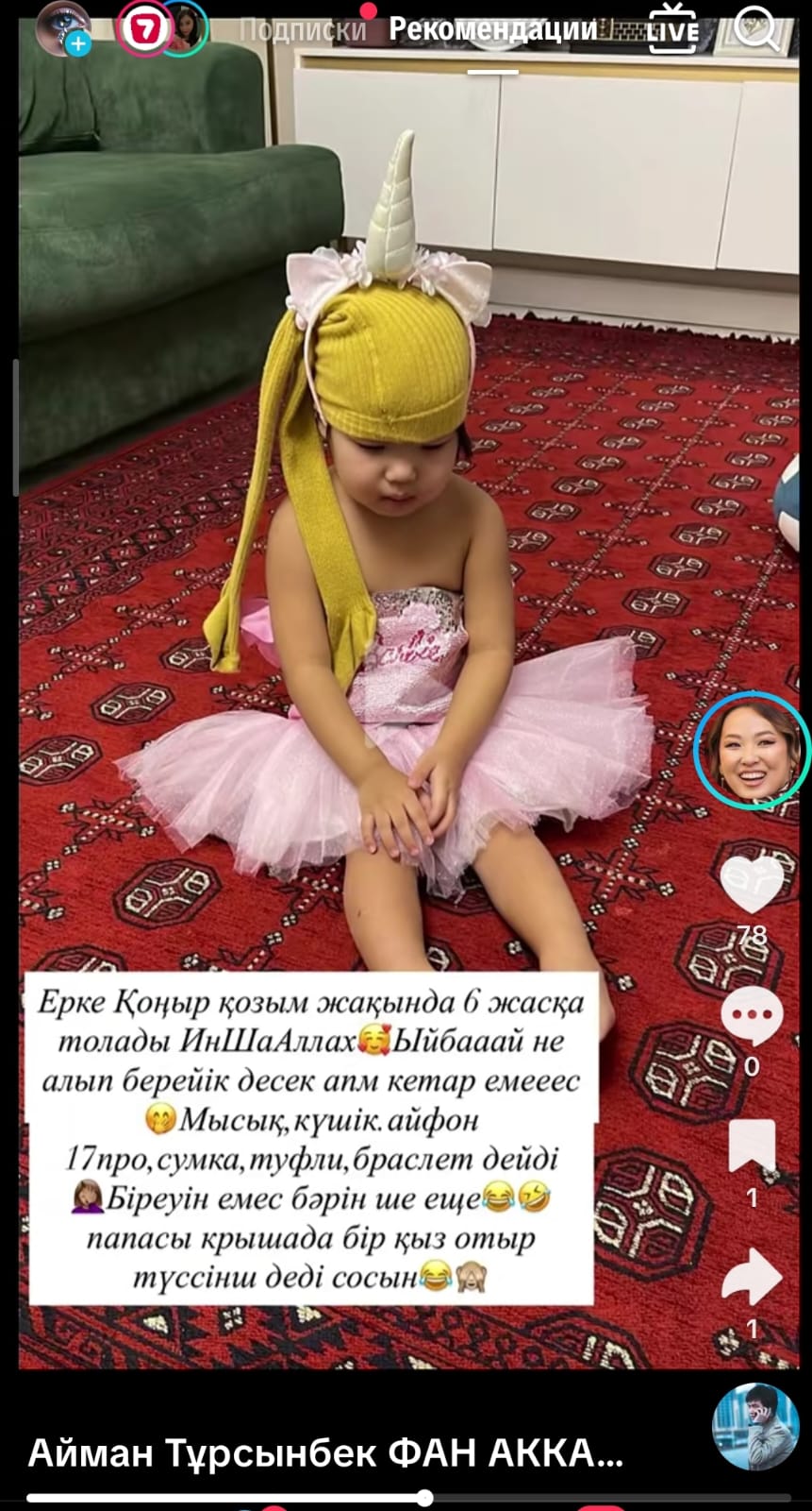"Ерке қоңыр қозым жақында алтыға толады. Туған күніне мысық, күшік, айфон 17 pro, сумка, туфли, браслет сұрады. Папасы бір қыз крышада отыр, түссінші деді" деп жазды Айман.
