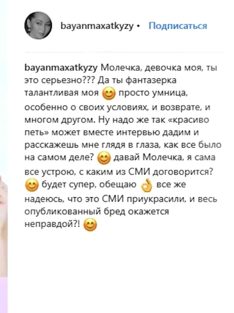 Баян Мақсатқызы өз жазбасында Мөлдірдің әрекетін түсінбейтінін айтып, эмоциясын жасырмады.