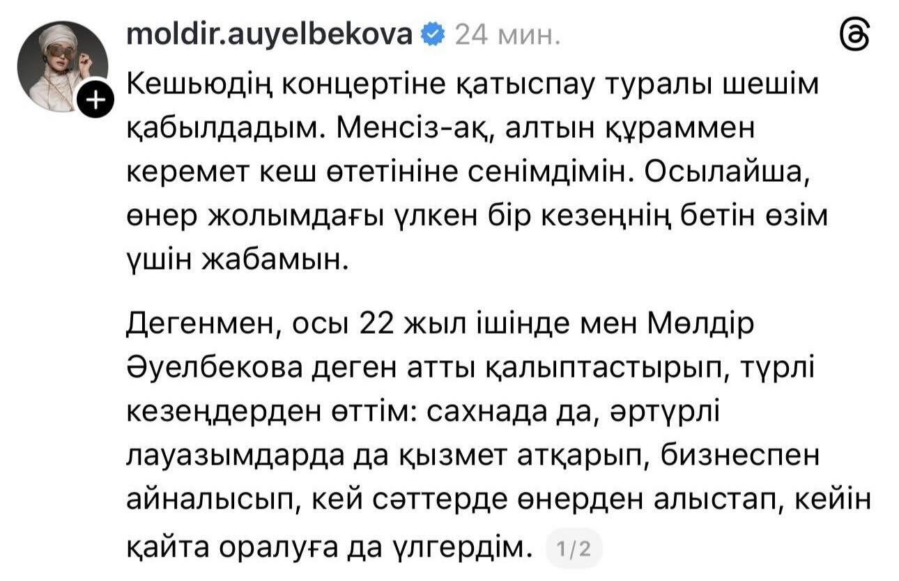 Бұған дейін Мөлдір Әуелбекова әлеуметтік желідегі парақшасында KeshYOU тобының 20 жылдығына арналған концертке қатыспайтынын мәлімдеген еді. Әншінің бұл шешімі продюсердің наразылығын тудырды.