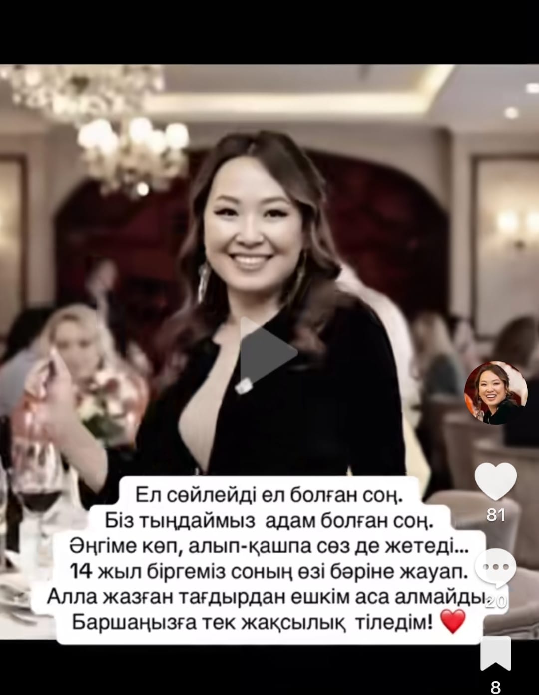 "Ел сөйлейді ел болған соң. Біз тыңдаймыз адам болған соң. Әңгіме көп. Алып-қашпа сөз де жетеді. 14 жыл біргеміз, соның өзі жауап. Алла жазған тағдырдан ешкім аса алмайды. Баршаңызға тек жақсылық тіледім" деген жазбамен фото жариялаған Айман "мен оны Алладан сұрап алдым" деген әнді қосып қойған.