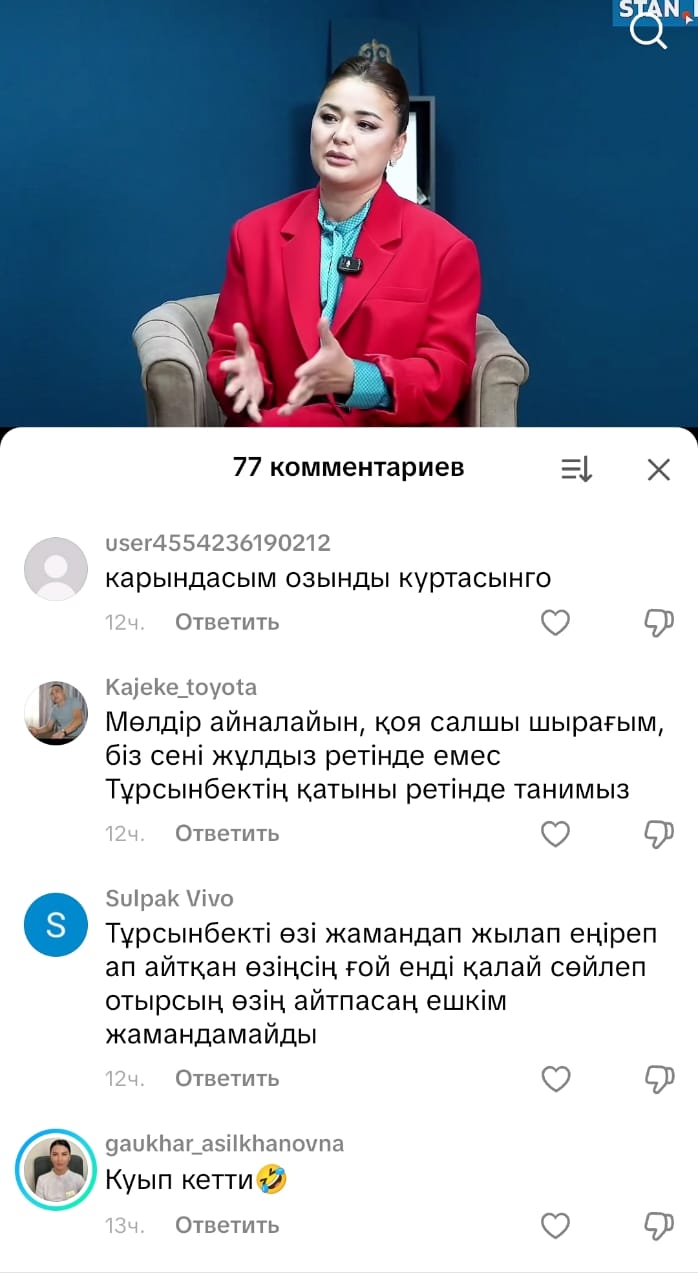 Stan.kz. сайтына берген сұхбатында Тұрсынбек Қабатовтың әйелі Мөлдір Мұқанова "Әзіл әлемі" жобасы туралы айтты деп жазады Democrat.kz.