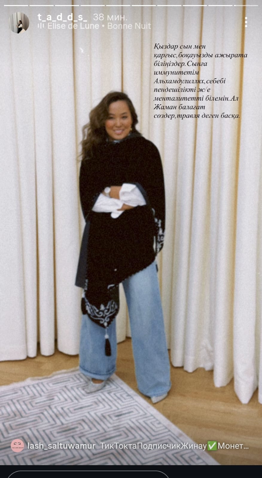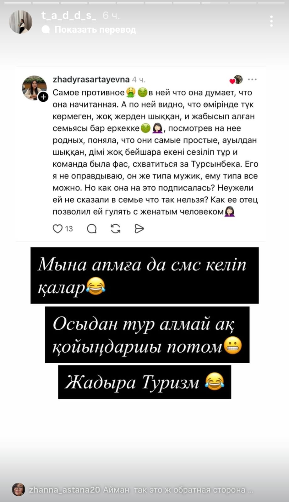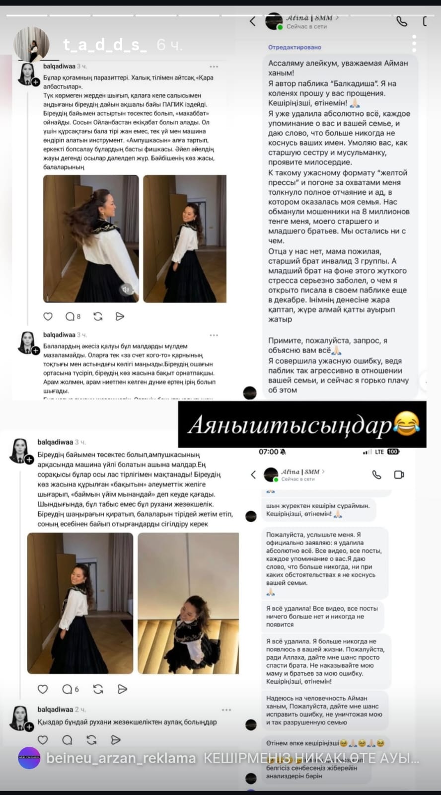 Айманның сторисінде жариялаған скрин жазбаларда әлеуметтік желіде өзіне қатысты ауыр сөздер жазғандарды жазаға тартуды бастағанын байқауға болады.