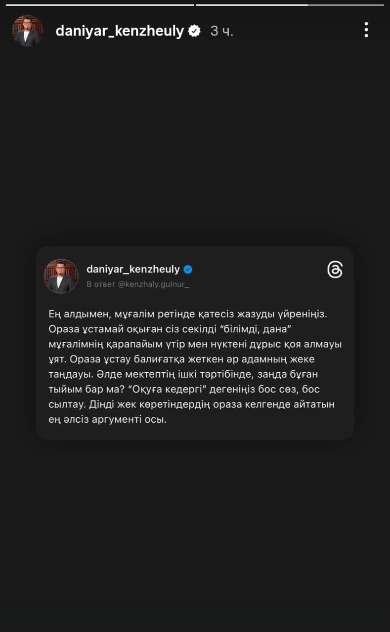 Данияр уағызшы өзінің әлеуметтік желі сторисында: "Ең алдымен қатесіз жазуды үйреніңіз. Ораза ұстамай оқыған сіз секілді "білімді, дана" мұғалімнің үтір мен нүктені дұрыс қоя алмауы ұят.