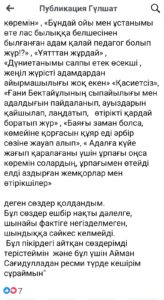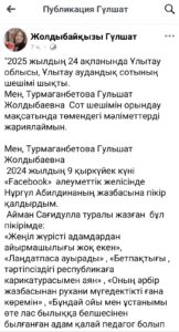 “Құтты болсын, Aiman Sagidulla әріптес! Гүлшат Жолдыбайқызы деген өз қателігін түсініп сенен кешірім сұрапты.. Мен қазбаламай-ақ қояйын... Ар жағын Астана қаласы Білім саласында сапаны қамтамасыз ету Департаменті жанындағы Әдеп кеңесі ойлана жатар...” деген Өмір Шыныбекұлы Алтынсарын атындағы Ұлттық білім беру академиясының қызметкері Гүлшат Тұрмағанбетованың жазбасын тұтастай жариялады. Даудың басы... Бұл дау қалай басталып еді? Белсенді ұстаз Айман Сағидулла Гүлшат Тұрмағанбетованы не үшін сотқа берген? Осы сұрақтарға жауап іздеп, әлеуметтік желілерді ақтарып көрдік. Естеріңізде болса, 2023 жылы бір топ мұғалім министр Ғани Бейсембаевтың отставкасын сұрап, Президентке ашық хат жазған-ды. Біздің түсінуімізше, даулы мәселе осы кезде басталған көрінеді. Міне, осы тұста министр Ғани Бейсембаевтың "қорғаушысы" рөлін өздеріне "иемденген" санаулы кісі әлеуметтік желілерде ашық хатқа қол қойған мұғалімдерге қырғидай тиіп, ауыр сөздер жазып, мазаларын алуды бастаған. Солардың  бірі Гүлшат Тұрмағанбетова әлеуметтік желіде белсенді ұстаз Айман Сағидулланың ар-намысына тиетін, әдепсіз сөздер жазған. Бұл туралы кезінде белсенді ұстаз Мейіржан Темірбек өзінің парақшасында төмендегі скринді жариялаған екен. "Рухани мүгедек", "былыққа белшесінен былғанған", "қалай педагог болып жүр?", ұяттан жұрдай", "салпы етек өсекші", "жеңіл жүрісті адамдардан айырмашылығы жоқ екен"... Өкінішке қарай, мына сөздерді "Ы.Алтынсарин" атындағы Ұлттық білім академиясының қызметкері жазған. Қош, сонымен бұл дау сотта қаралып,  Гүлшат Тұрмағанбетоваға "әлеуметтік желіде жазған ар-намысты қорлау сөздері үшін әлеуметтік желіде ұстаз Айман Сағидулладан кешірім сұрауға міндеттеу" туралы соттың шешімі шықты. Сот шешімі өз күшіне енді. Бүгін  Ы.Алтынсарин атындағы Ұлттық білім беру академиясының қызметкері Гүлшат Тұрмағанбетова өзінің әлеуметтік желідегі парақшасында кінәсін мойындап, ұстаз Айман Сағидулладан ресми кешірім сұрап, жазба жариялады. Өз сөзінде ол былай депті: "2025 жылдың 24 ақпанында Ұлытау облысы, Ұлытау аудандық сотының шешімі шықты. Мен, Турмаганбетова Гульшат Жолдыбаевна Сот шешімін орындау мақсатында төмендегі мәліметтерді жариялаймын. Мен, Турмаганбетова Гульшат Жолдыбаевна 2024 жылдың 9 қыркүйек күні «Facebook» әлеуметтік желісінде Нұргүл Абилдинаның жазбасына пікір қалдырдым. Айман Сағидулла туралы жазған бұл пікірімде: