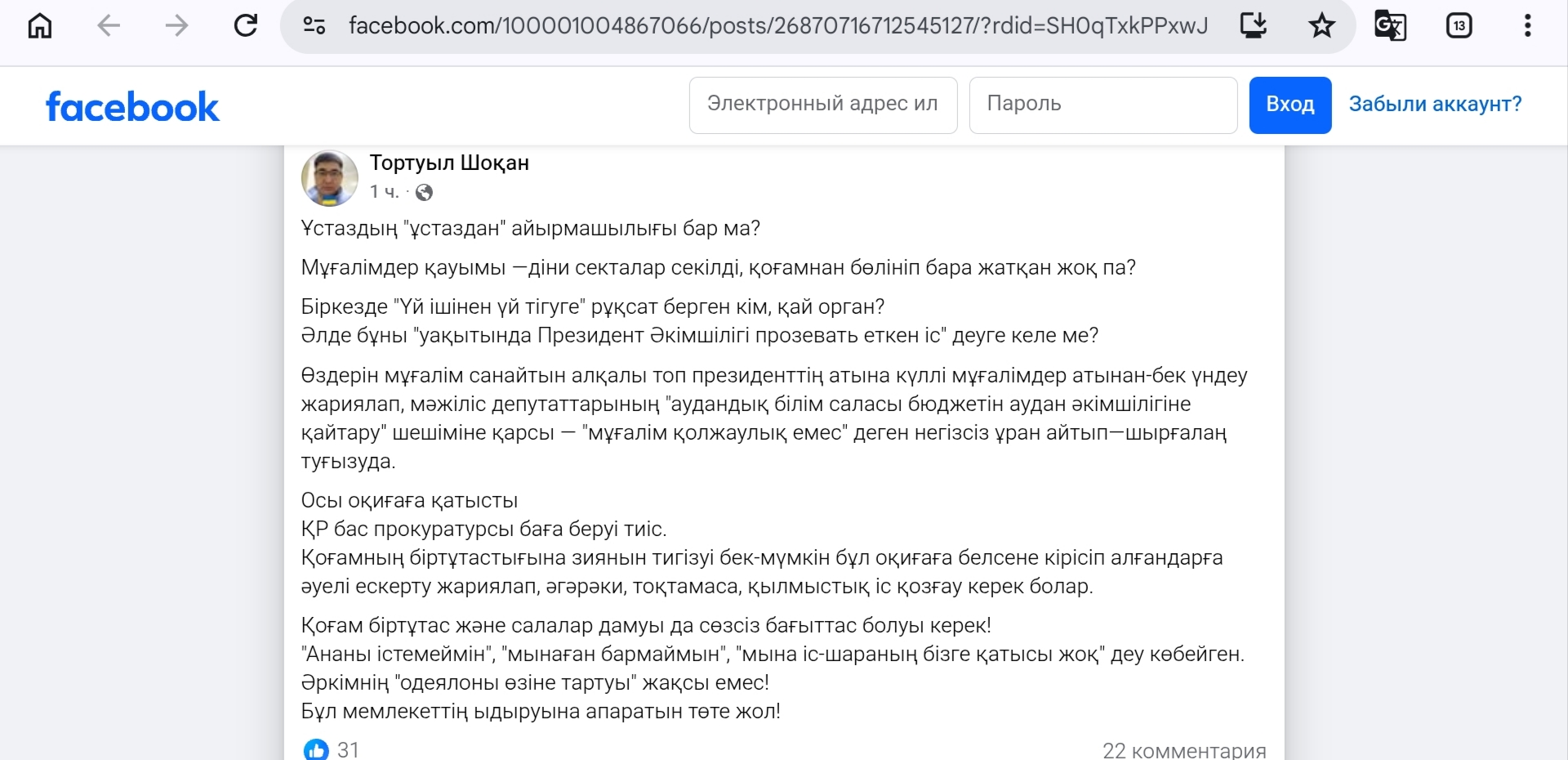 Қоғам белсендісі, кезінде өзі де әкімдік қызметкері болған, былайғы жұртқа "Төртуыл Шоқан" атымен танымал азамат бүгінгі үндеу жасаған белсенді педагогтардың әрекетін сынап, мәселеге Баспрокуратураның назар аударуы керегін айтты деп жазады Democrat.kz.